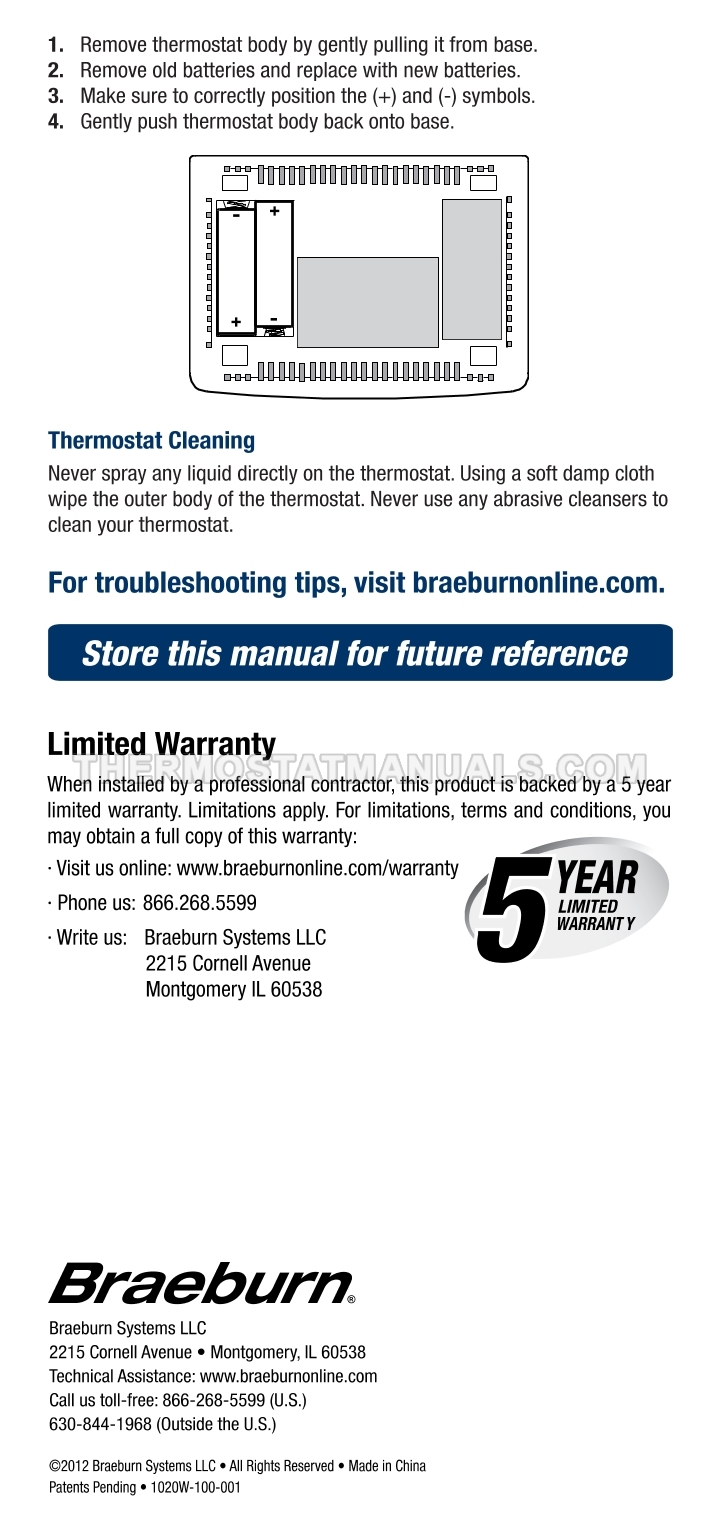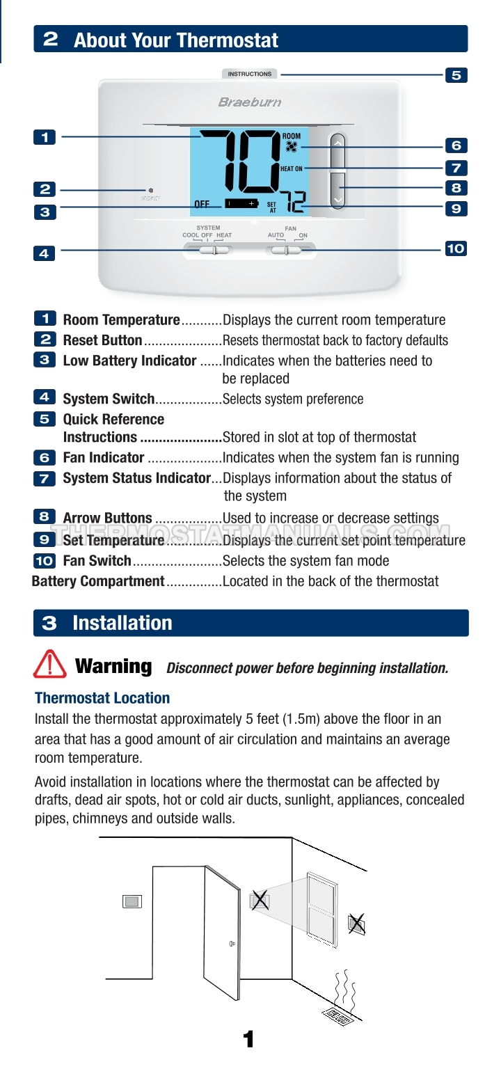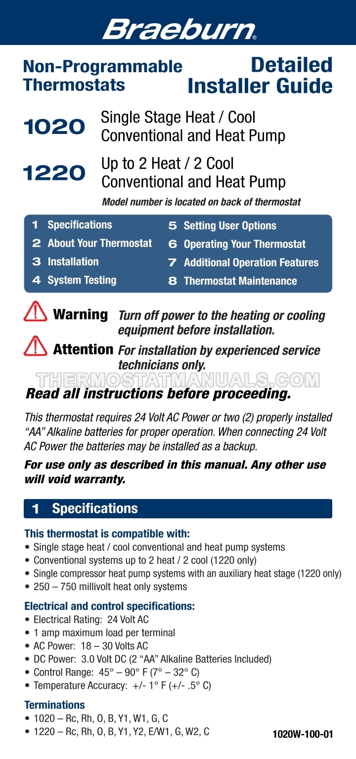 To replace the old thermostat and install the Braeburn 1020 Builder, follow the steps described in the installer guide on the 11 pages. This will allow the single stage heat / cool conventional and heat pump non-programmable thermostat to be installed correctly and proceed to device configuration.
