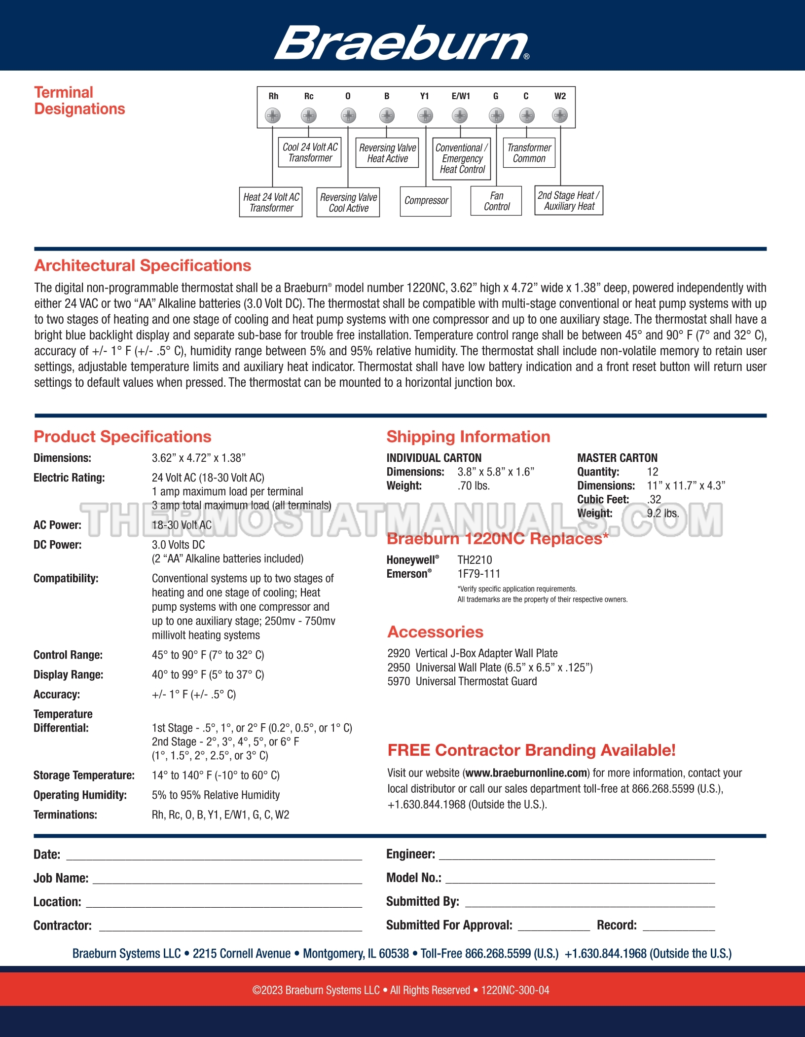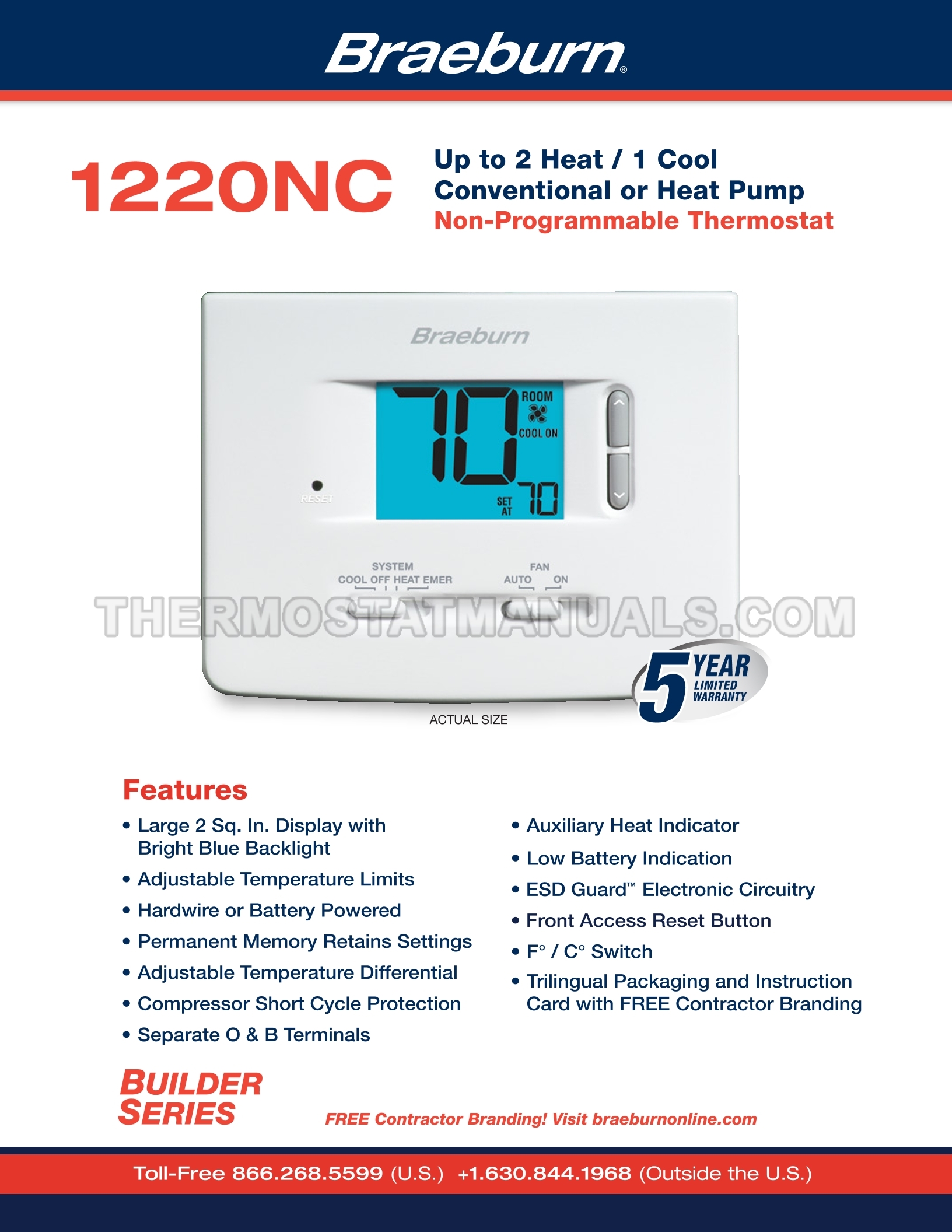 It is necessary to configure the non-programmable thermostat compatible with conventional and heat pump systems featuring 2 heat/1 cool staging before starting its work. This will further ensure continuous and correct operation of the Braeburn 1220NC Builder. Study the specifications sheet, which consists of 2 pages in English.
