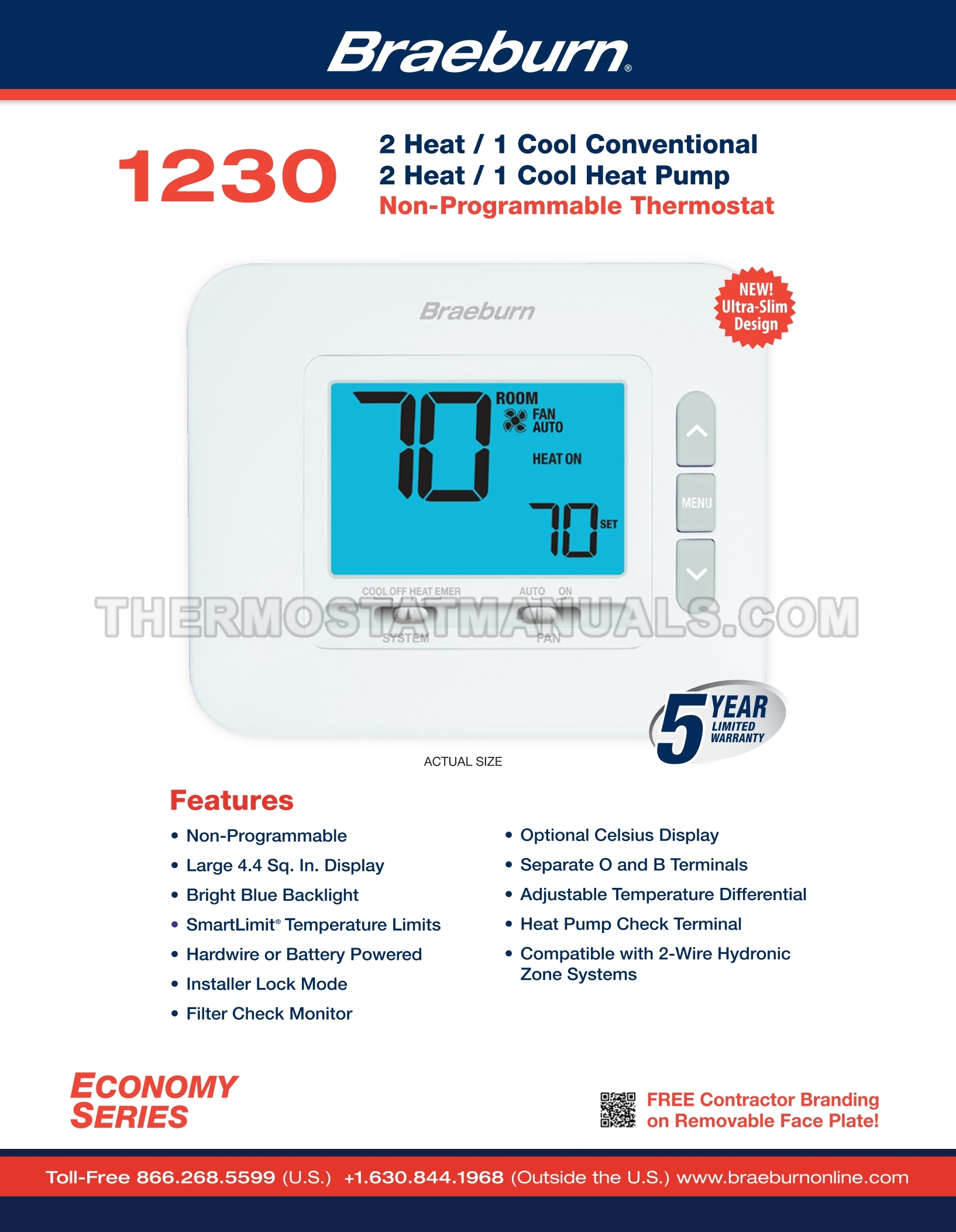 It is necessary to configure the non-programmable thermostat compatible with conventional and heat pump systems featuring 2 heat/1 cool staging before starting its work. This will further ensure continuous and correct operation of the Braeburn 1230 Economy. Study the specifications sheet, which consists of 2 pages in English.
