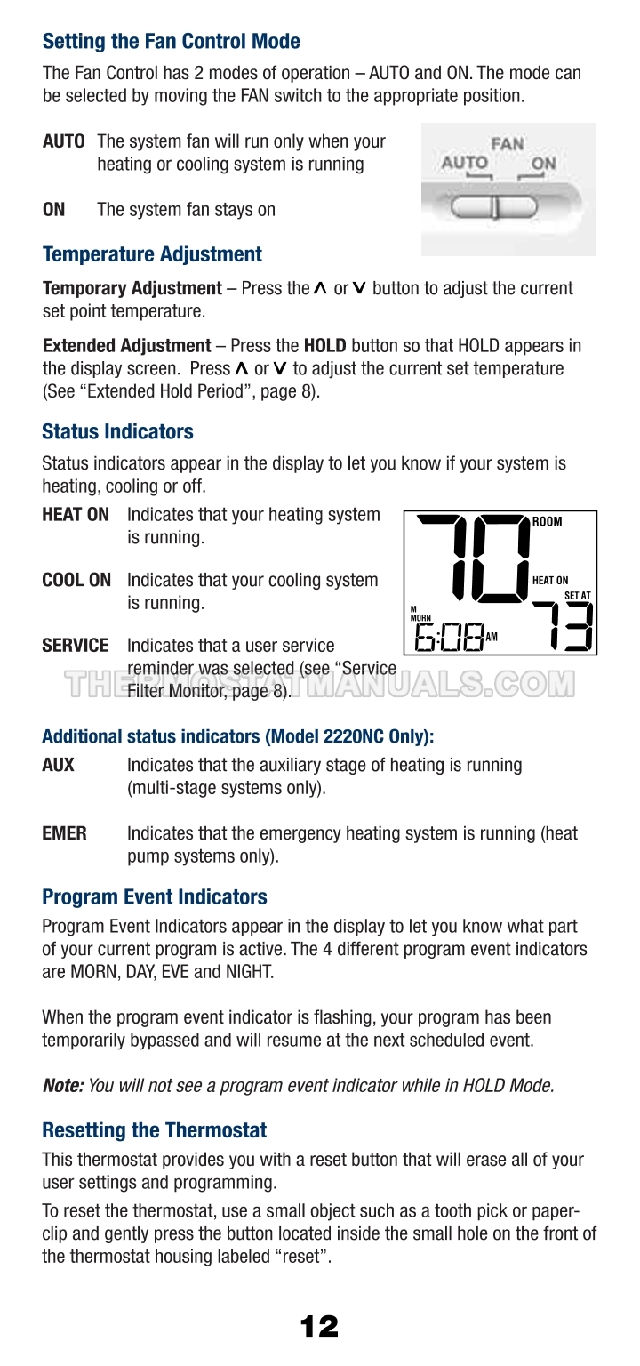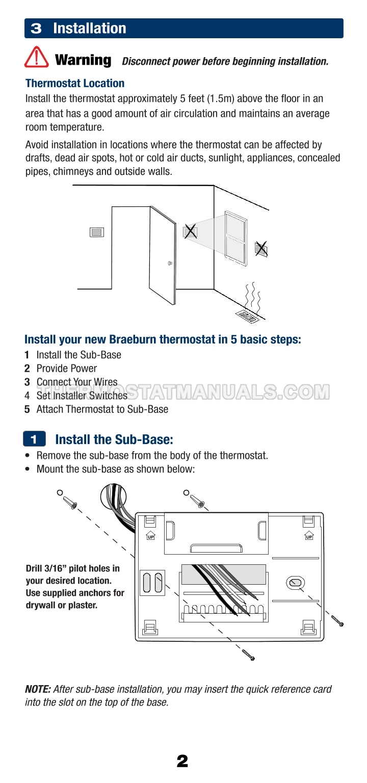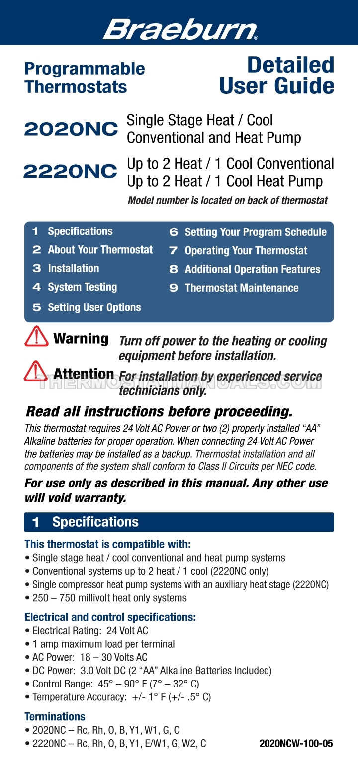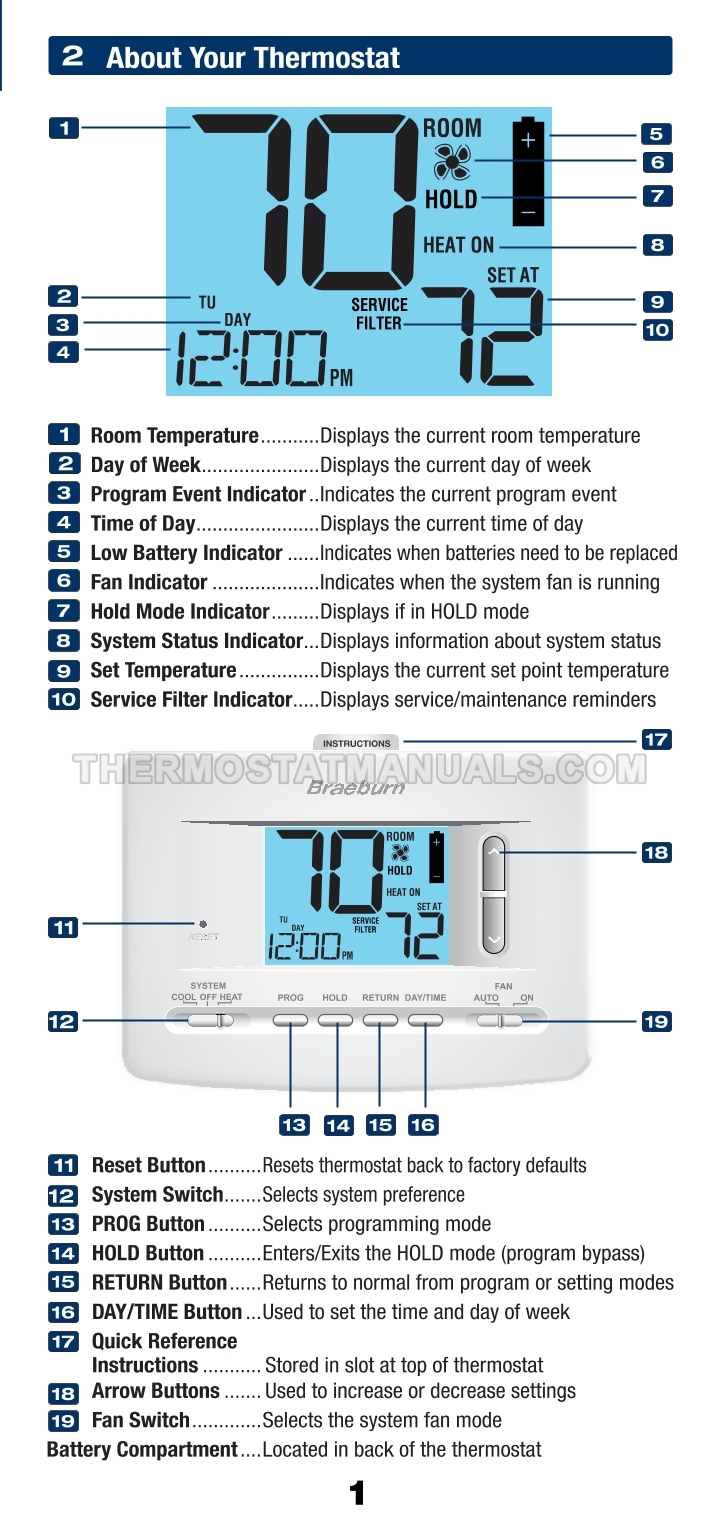 The use of Braeburn 2220NC Builder thermostats is one of the necessary measures to maintain a comfortable microclimate and ensure energy efficiency of heating and air conditioning in residential buildings, offices, hotels, etc. Thanks to user guide, you can learn about the main differences of the device and adjust the operation of the compact thermostat with 2 sq in display, bright blue backlight and adjustable temperature limits.