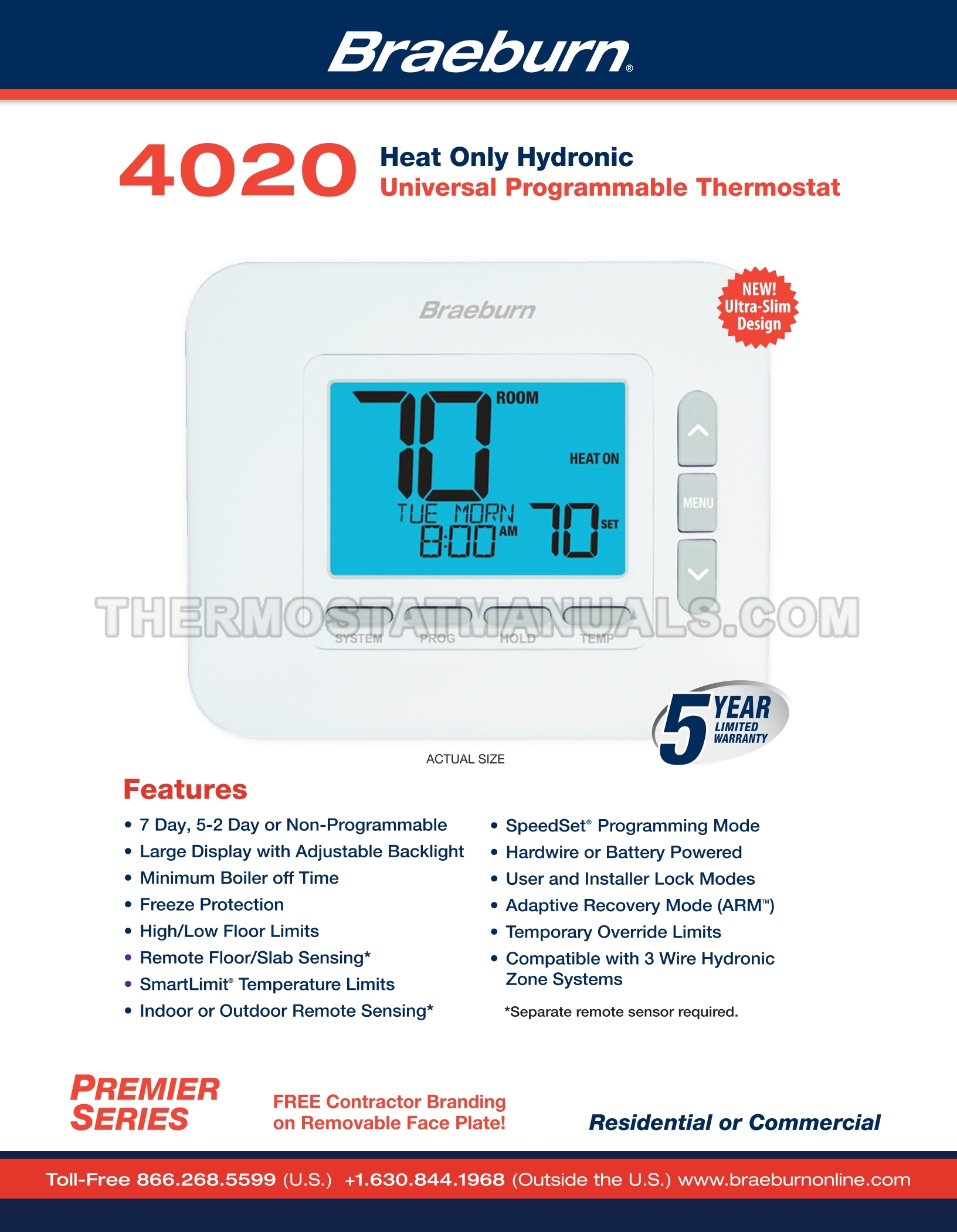 Braeburn 4020 Premier thermostats are designed for use in systems with gas or oil boilers, floor heating systems, electric heating or zone control. Check specifications sheet to set the appropriate hydronic thermostat with 7 day or 5-2 day programming and bright blue backlight settings.