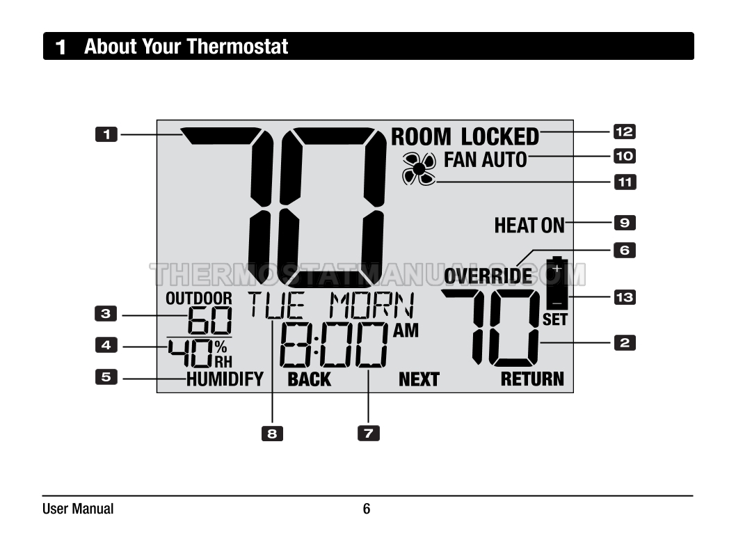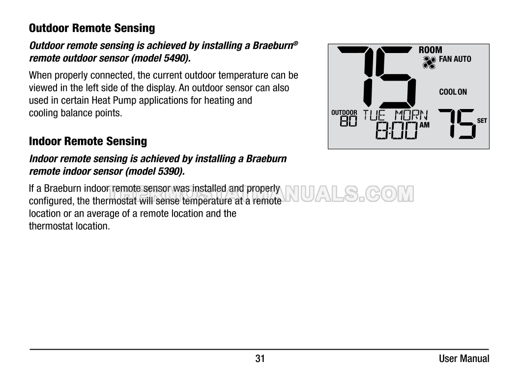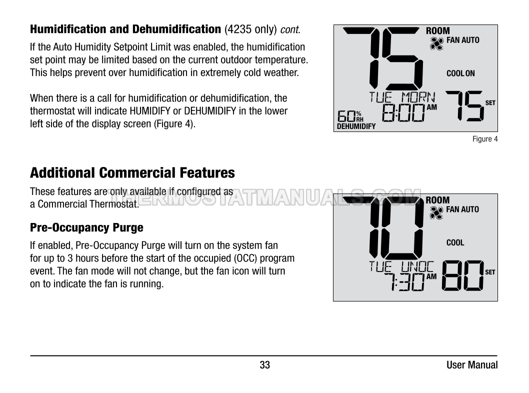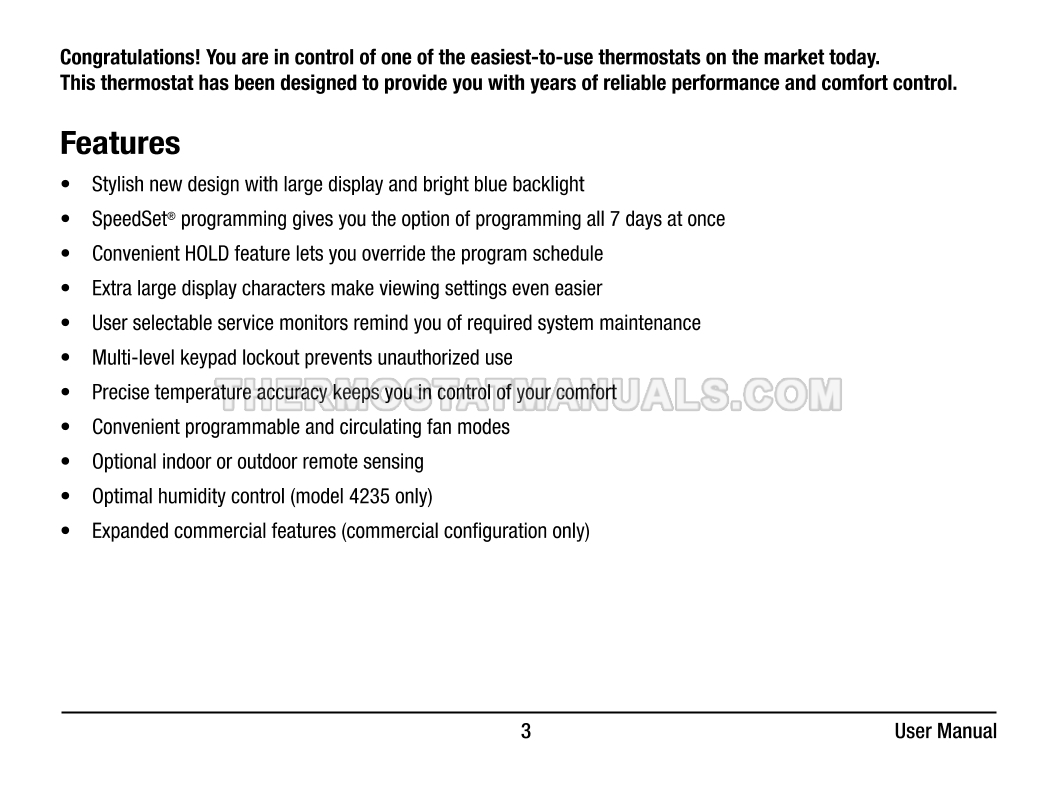 Automatic regulation of the room temperature and energy savings are the main tasks of the Braeburn 4235 Premier. This user manual contains all the information you need to configure the thermostat with commercial mode option, auto changeover, battery or hardwire power, keypad lockout, remote sensing, and dry contact input at the first start-up and further work.