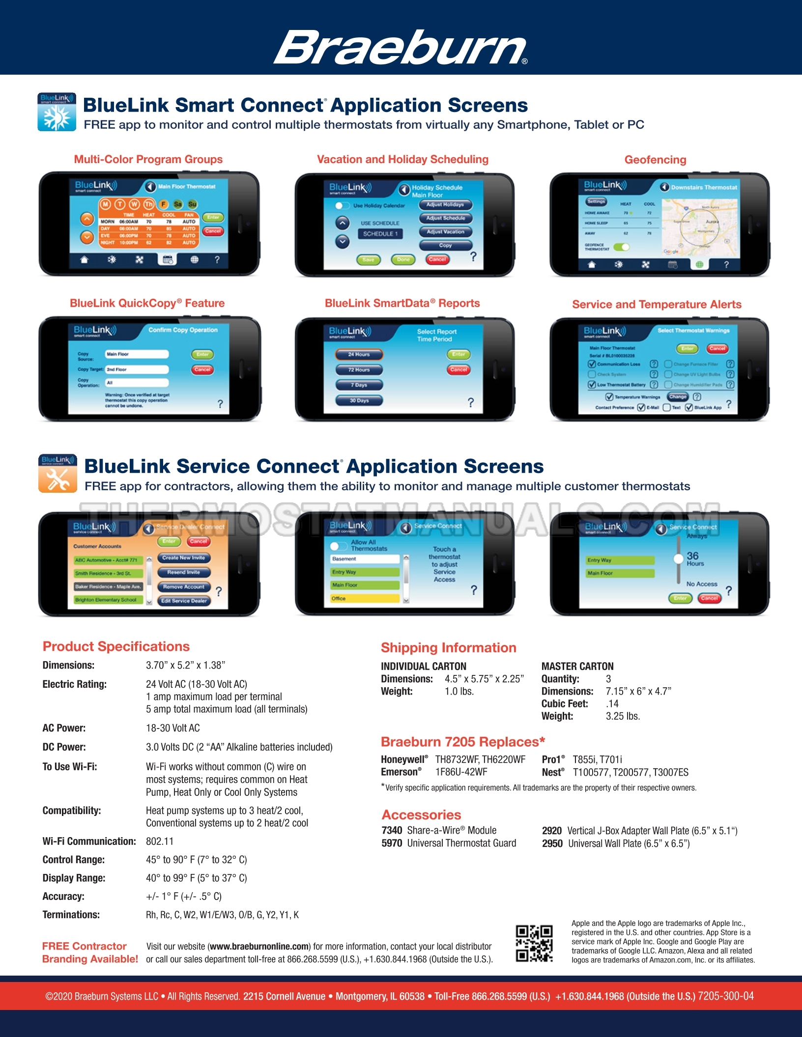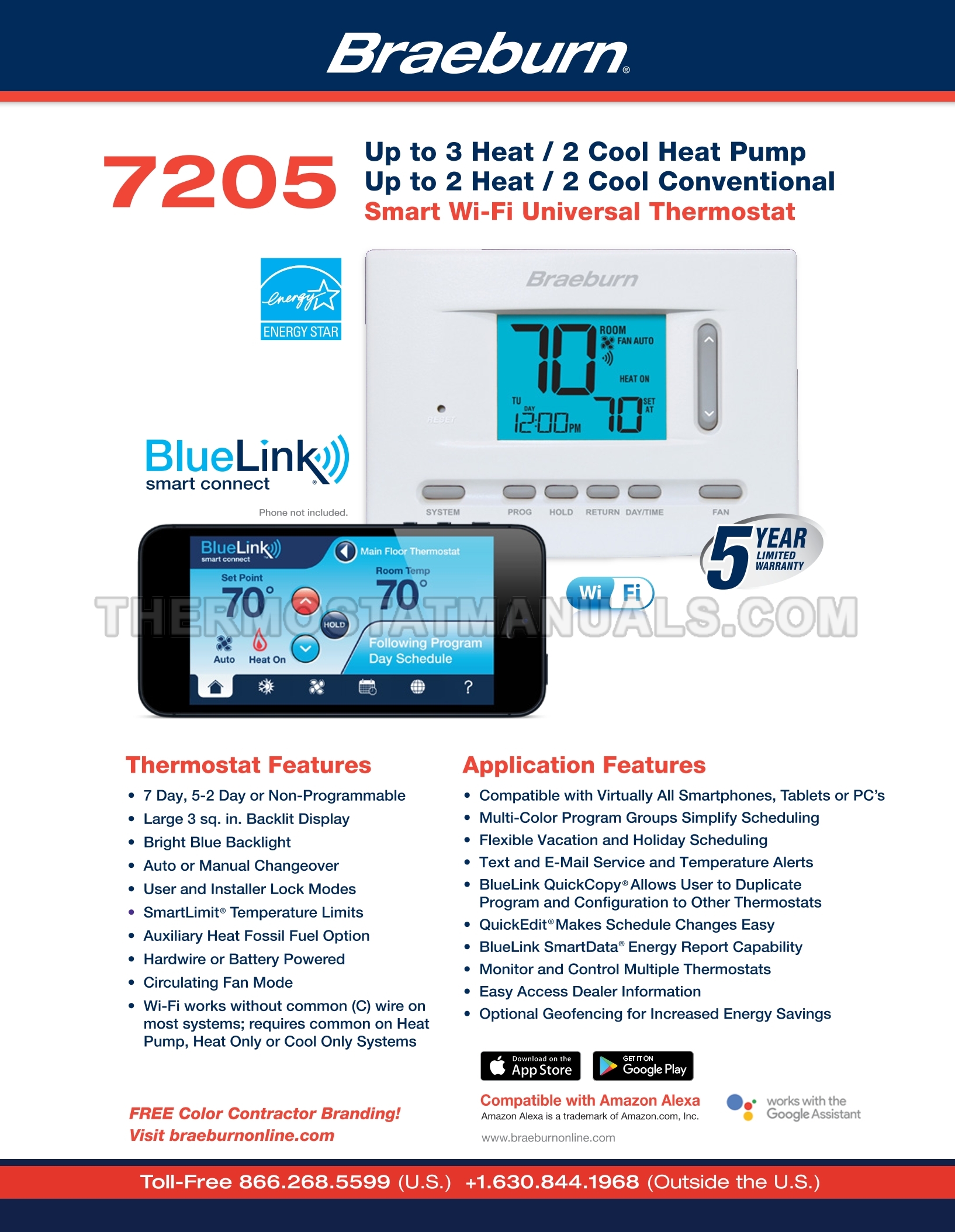 Braeburn 7205 Wi-Fi thermostats are designed for use in systems with gas or oil boilers, floor heating systems, electric heating or zone control. Check specifications sheet to set the appropriate BlueLink Wi-Fi thermostat compatible with conventional and heat pump systems featuring 3 heat/2 cool staging settings.