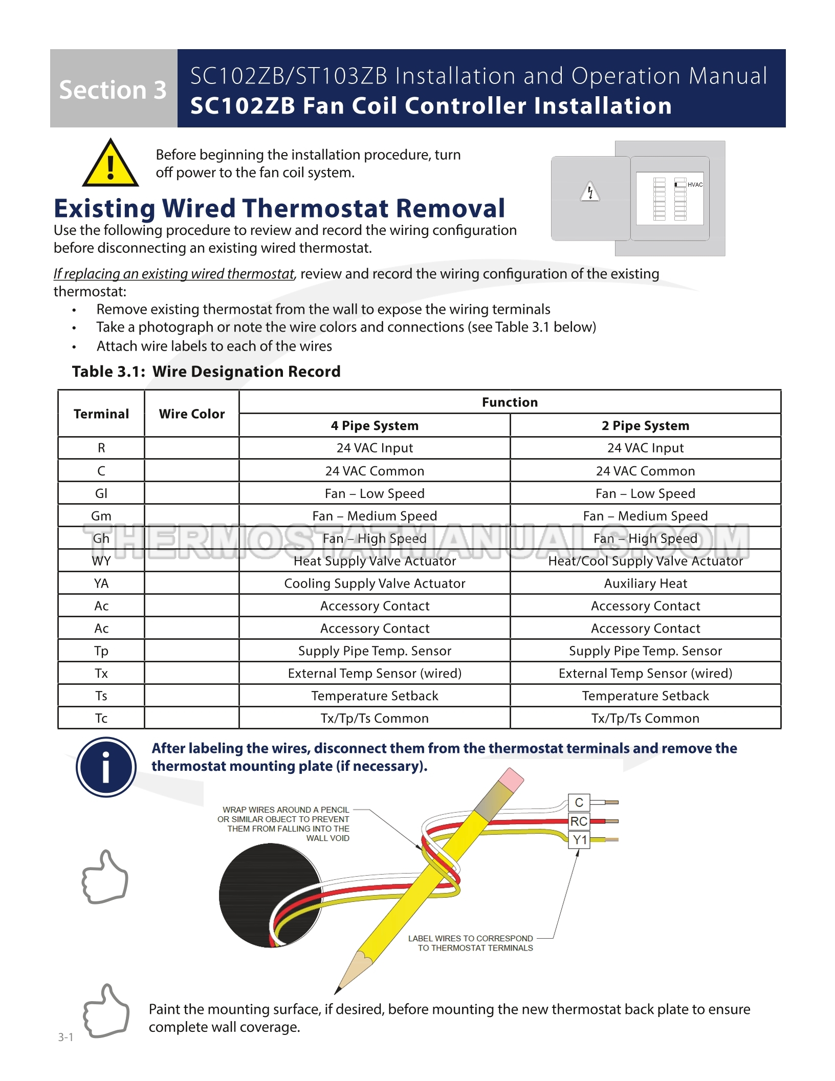 In most houses, installing a Braeburn SC102ZB thermostat is a simple task that takes up to 30 minutes. Step-by-step instructions are described in installation & operation manual and simplify the installation and wiring of the fan coil thermostat with 24VAC power, backlight, keypad lockout and auto changeover, so use this document as your basic guide on 35 pages in English.