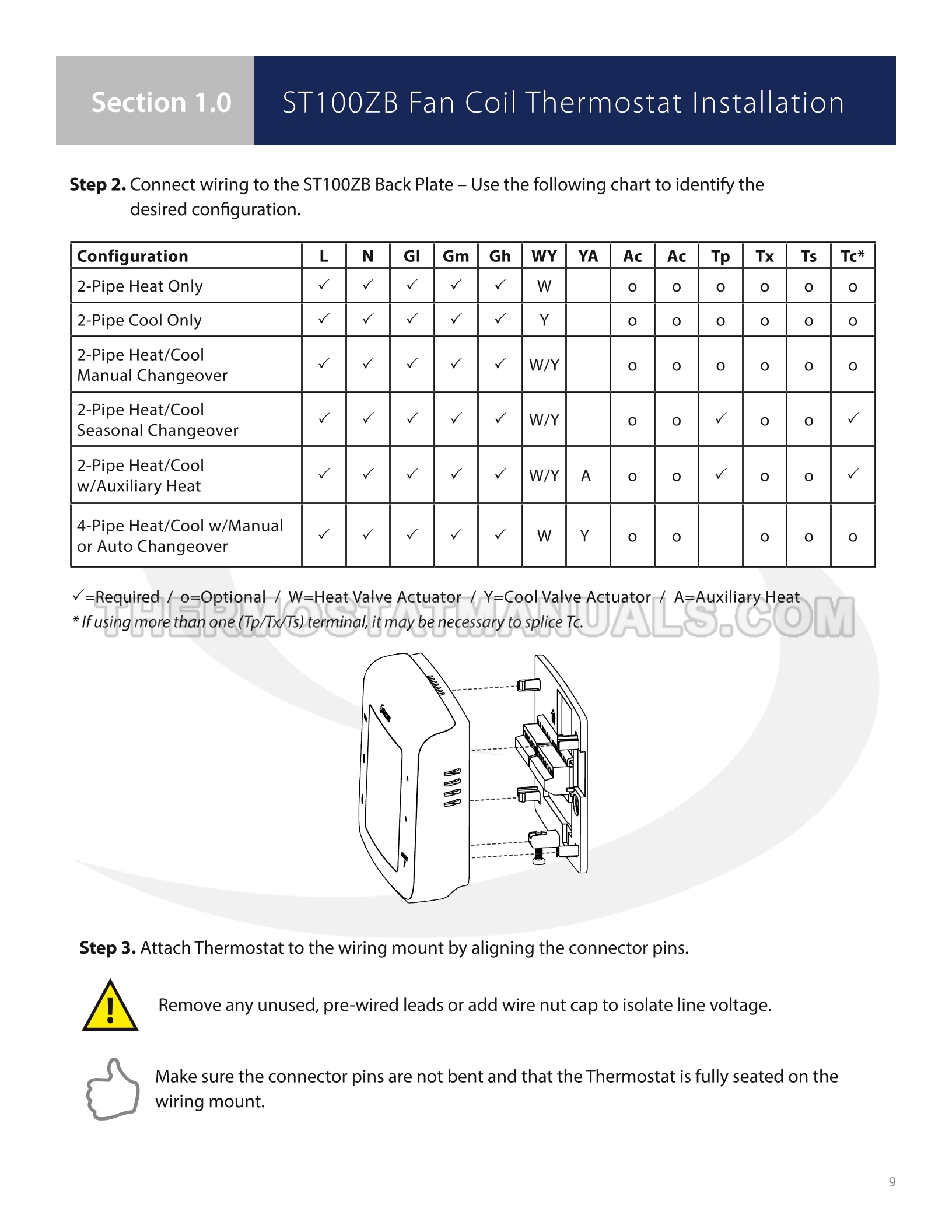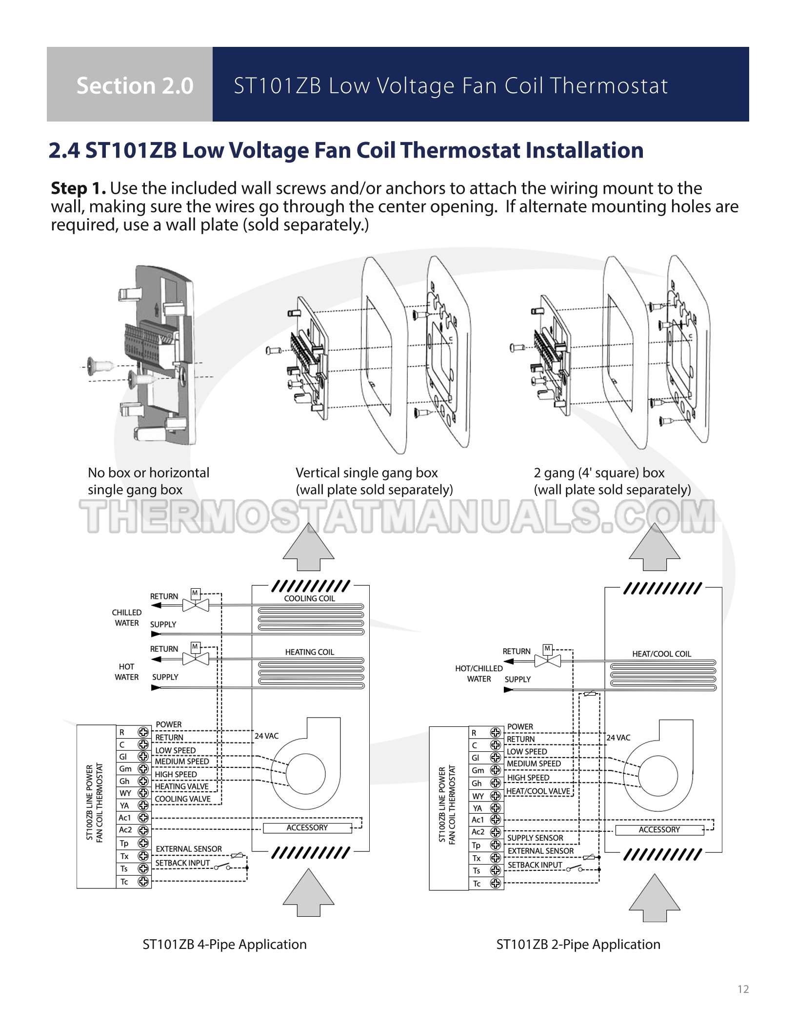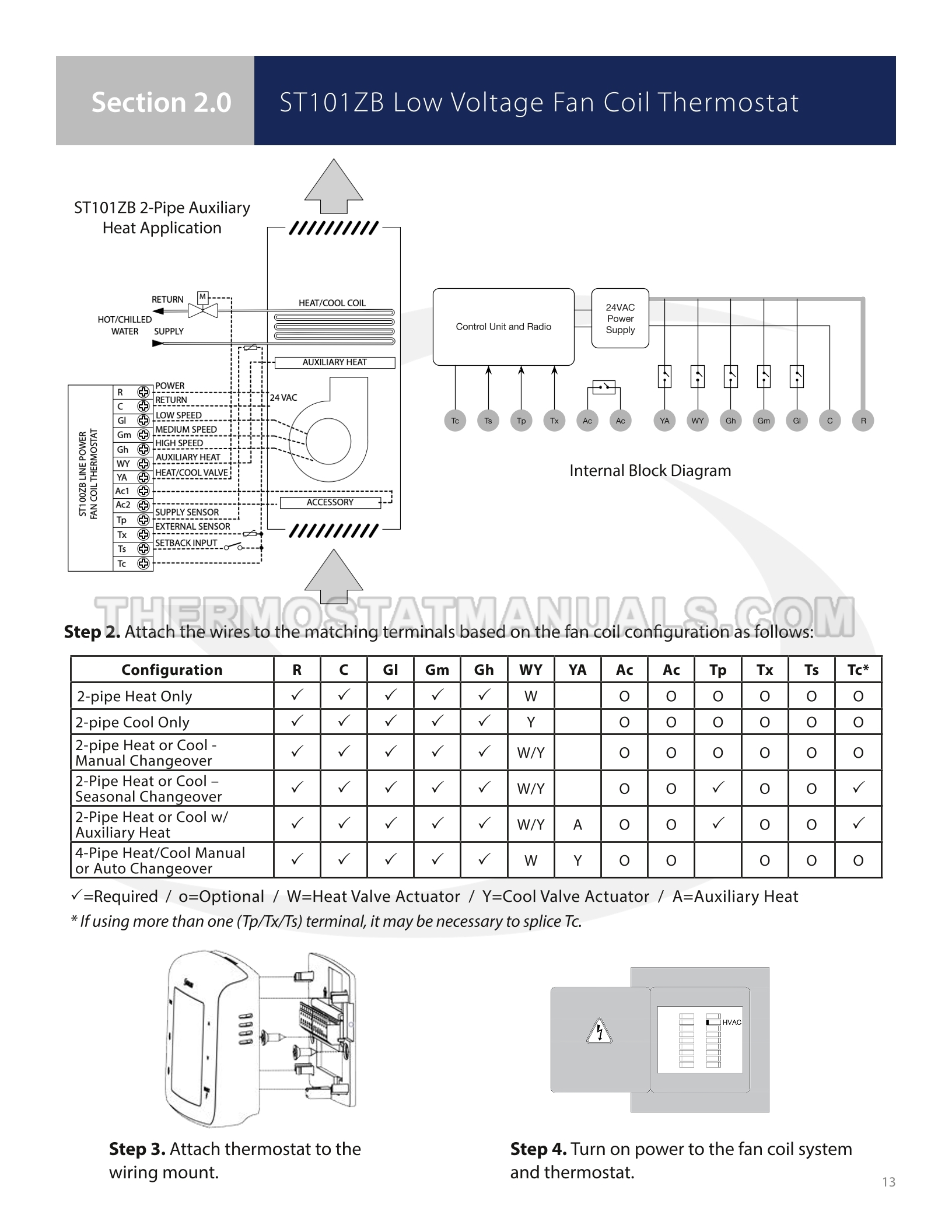To replace the old thermostat and install the Braeburn ST101ZB, follow the steps described in the installation & operation manual on the 38 pages. This will allow the fan coil thermostat with 24VAC power, backlight, keypad lockout, auto changeover and humidity reading to be installed correctly and proceed to device configuration.