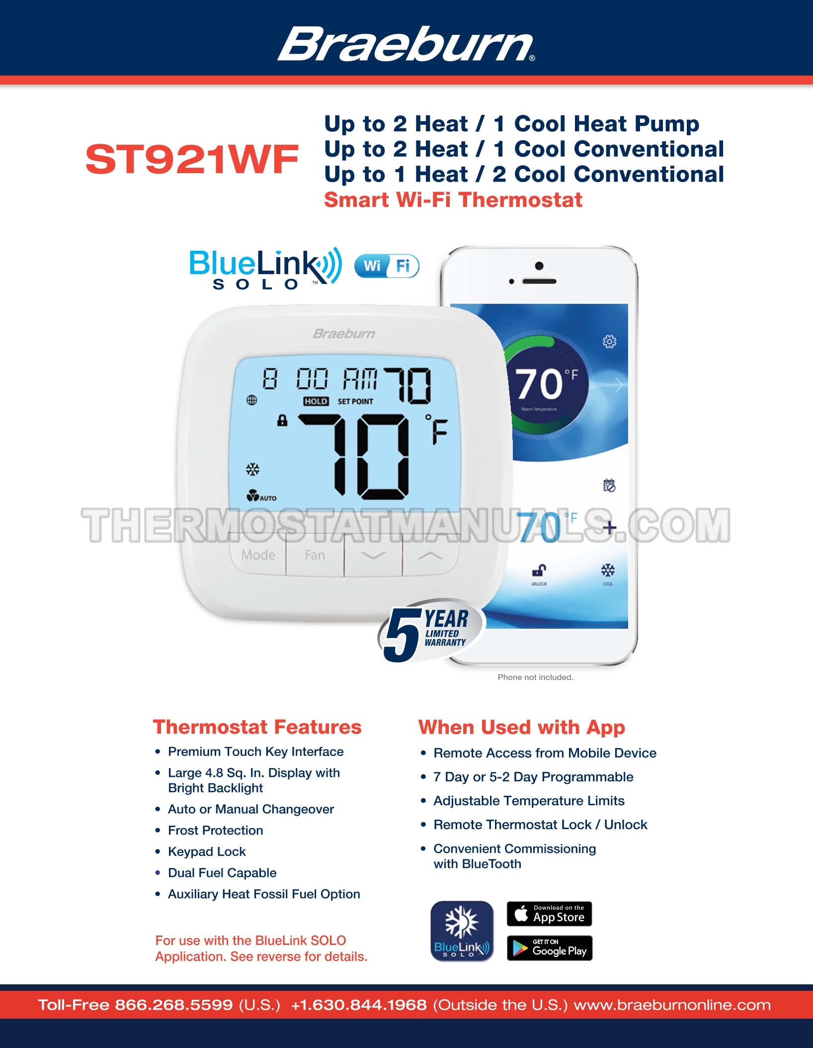 Automatic regulation of the room temperature and energy savings are the main tasks of the Braeburn ST921WF BlueLink SOLO. This specifications sheet contains all the information you need to configure the Wi-Fi thermostat from the BlueLink SOLO series with app-based programming, 2 heat/1 cool or 1 heat/2 cool staging and 4.8 sq in display at the first start-up and further work.