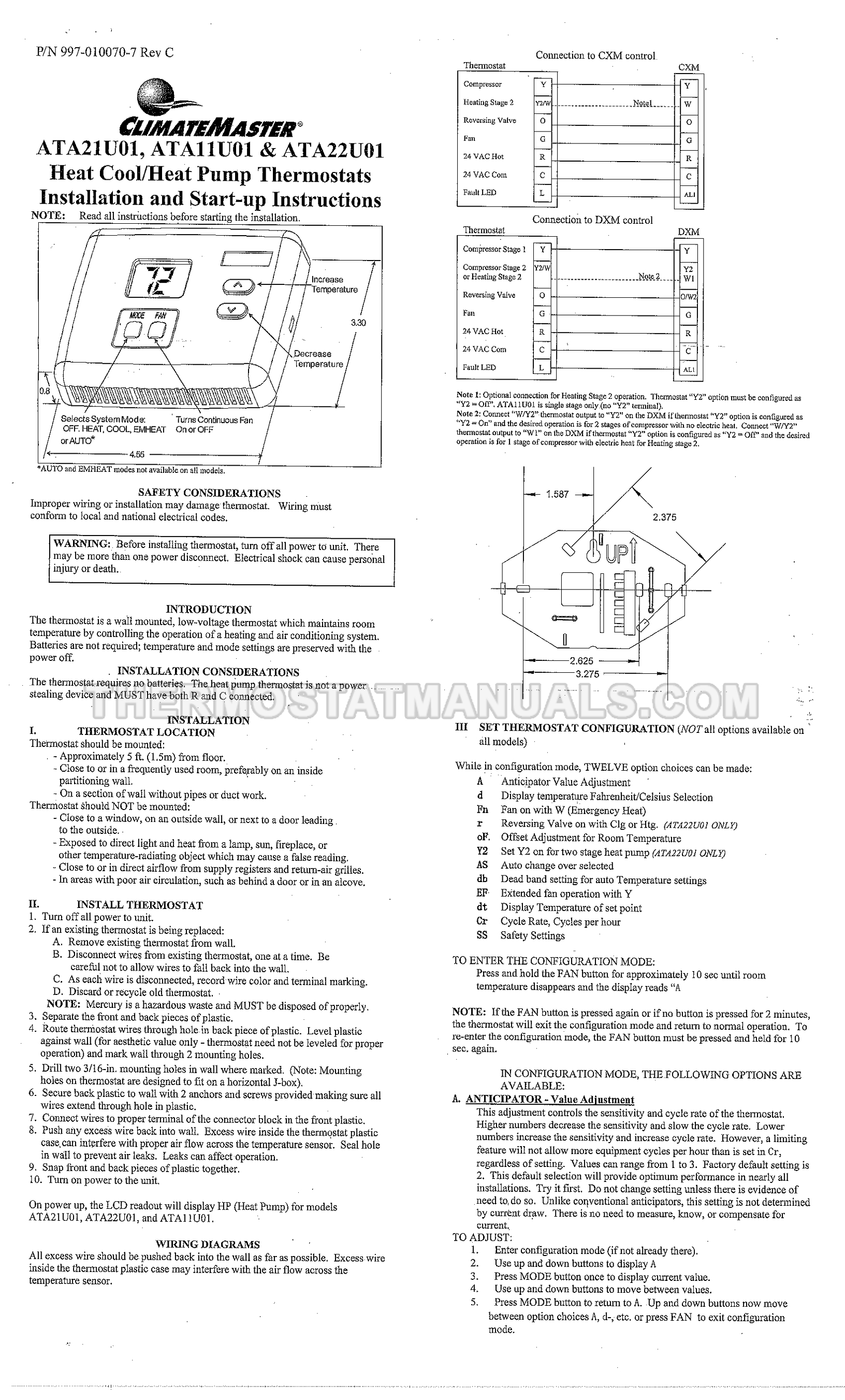 Learn how to install a Climatemaster ATA11U01 thermostat to control your energy bills. This installation instructions describes in details the sequence of steps required to connect the thermostat with configurable auto or manual changeover and selectable display of room temperature or setpoint.