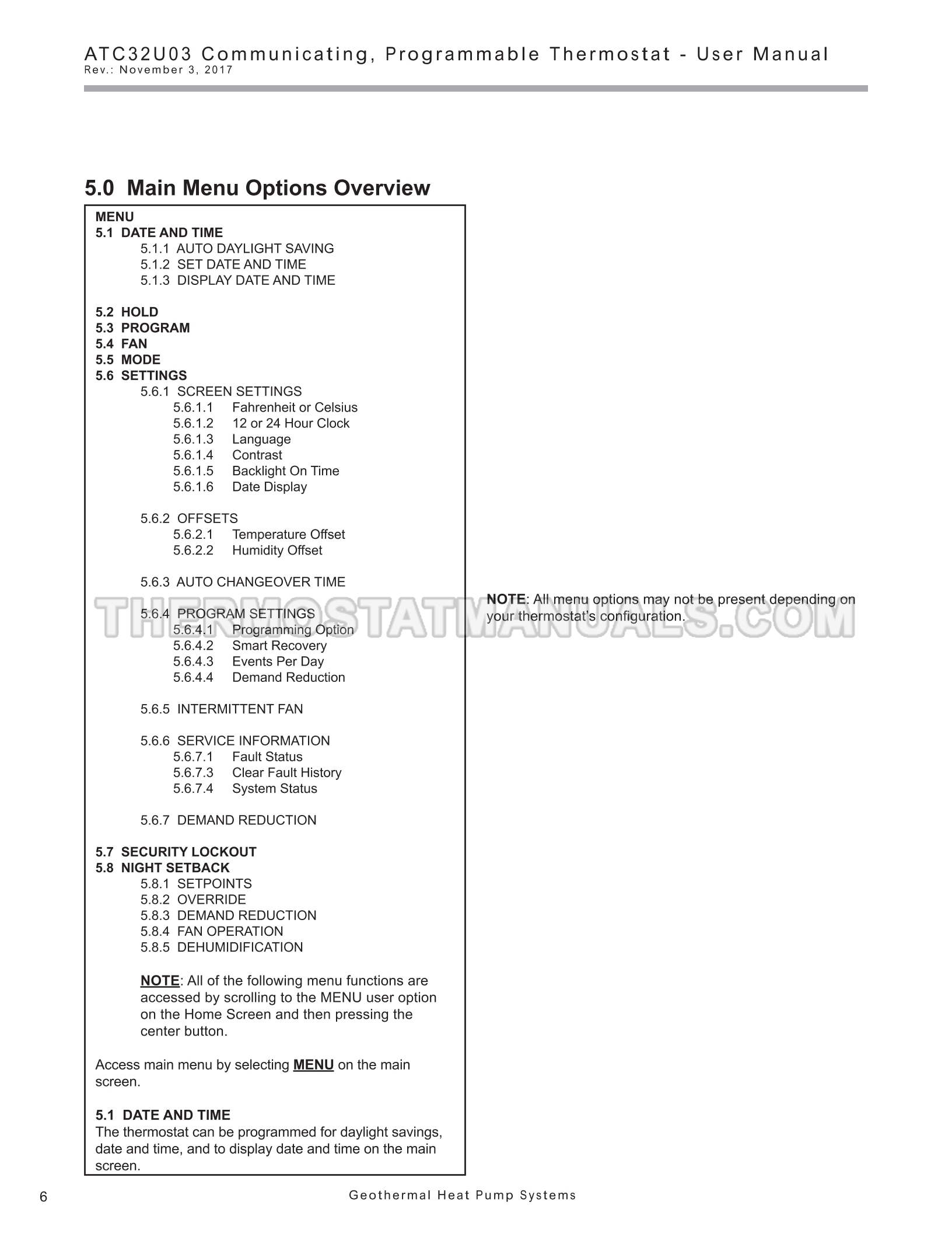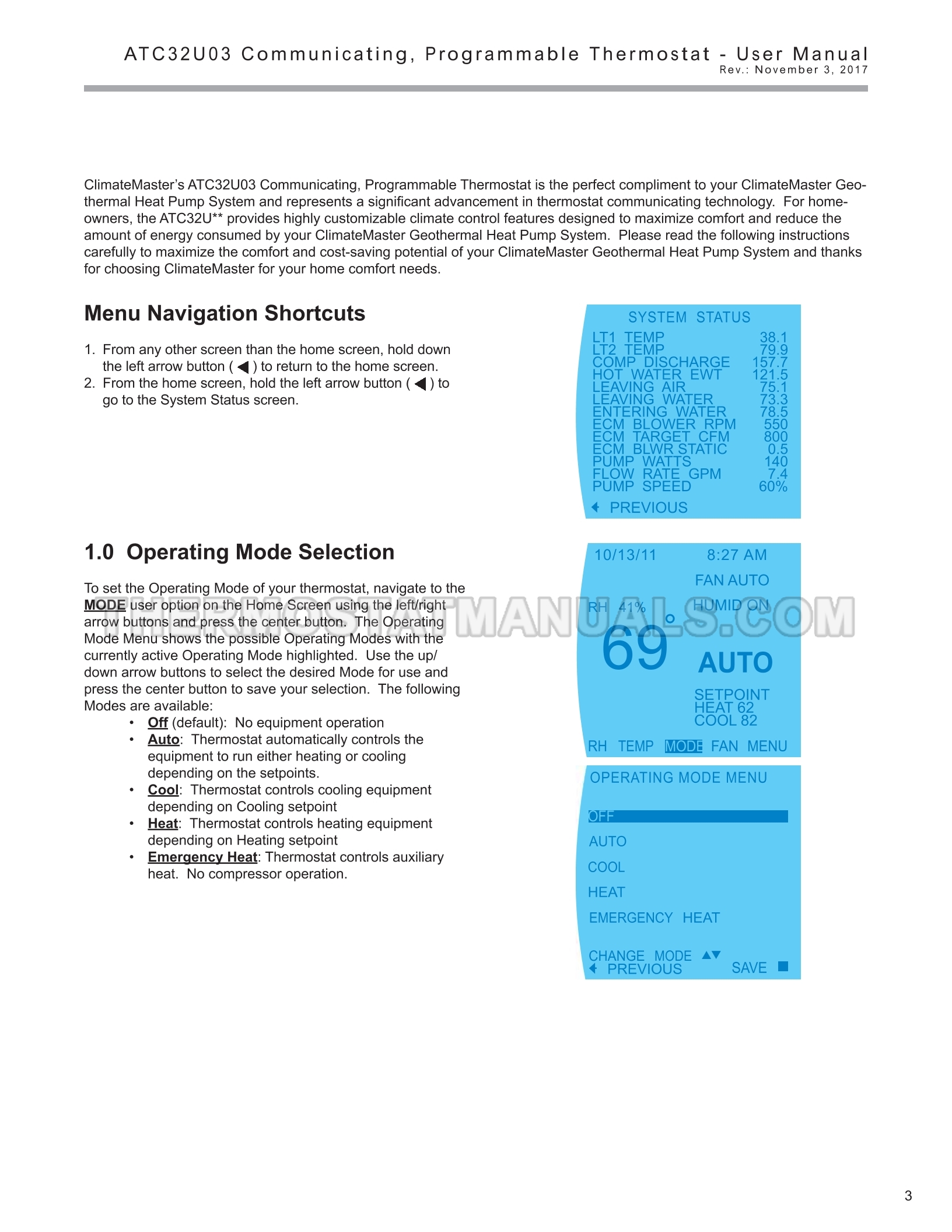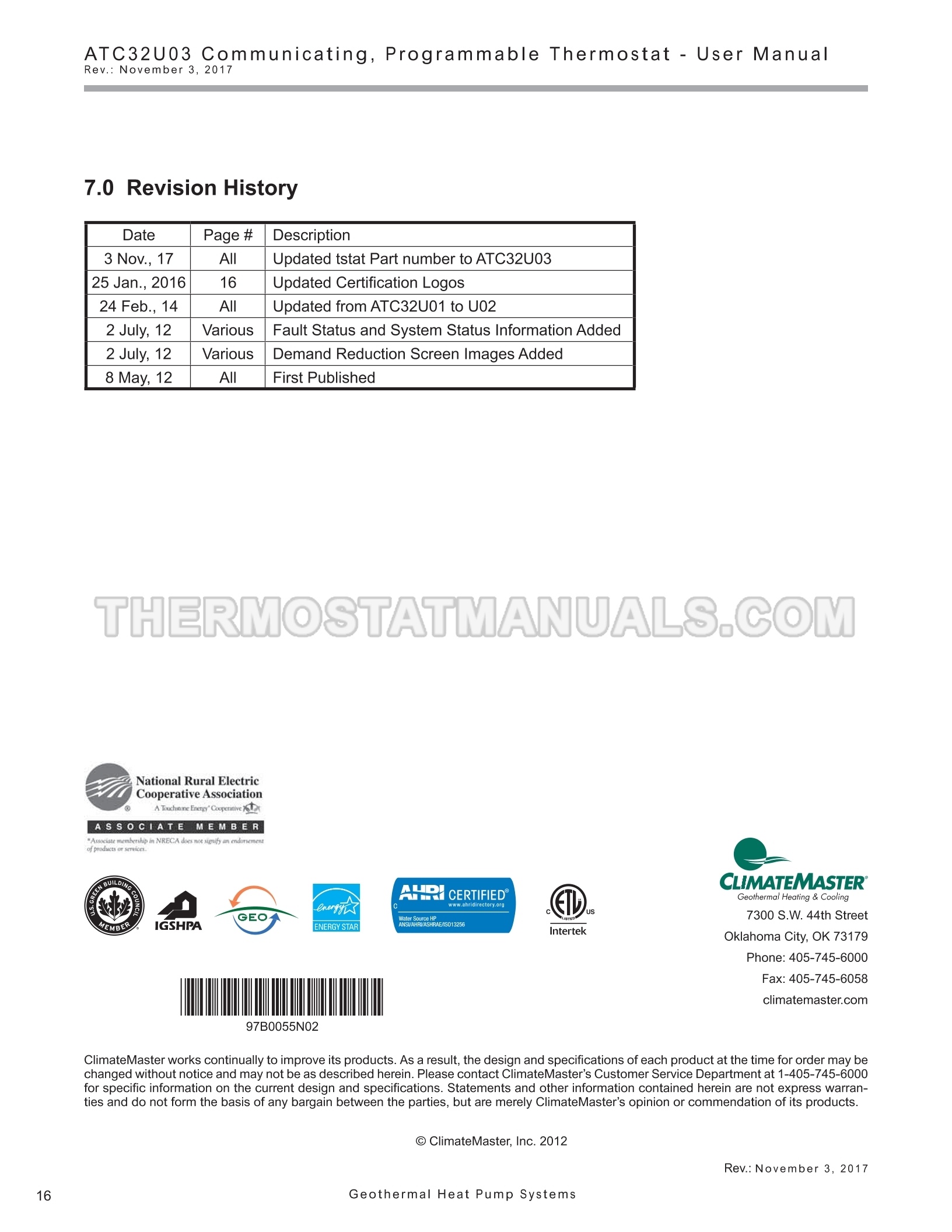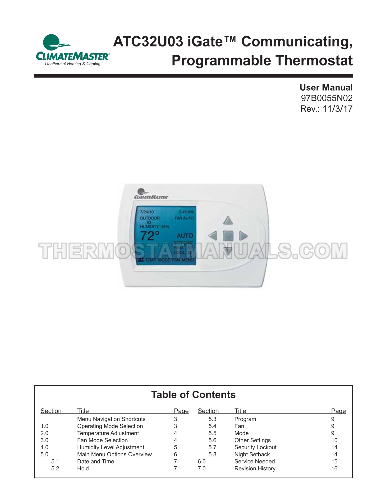 The Climatemaster ATC32U03C programmable thermostat offering advanced communication for geothermal systems to enhance comfort and reduce energy use thermostat can be used to manage the temperature of the rooms where it is installed. This user manual contains the 16 pages of information you need to get started with the device and configure for different applications based on needs correctly.