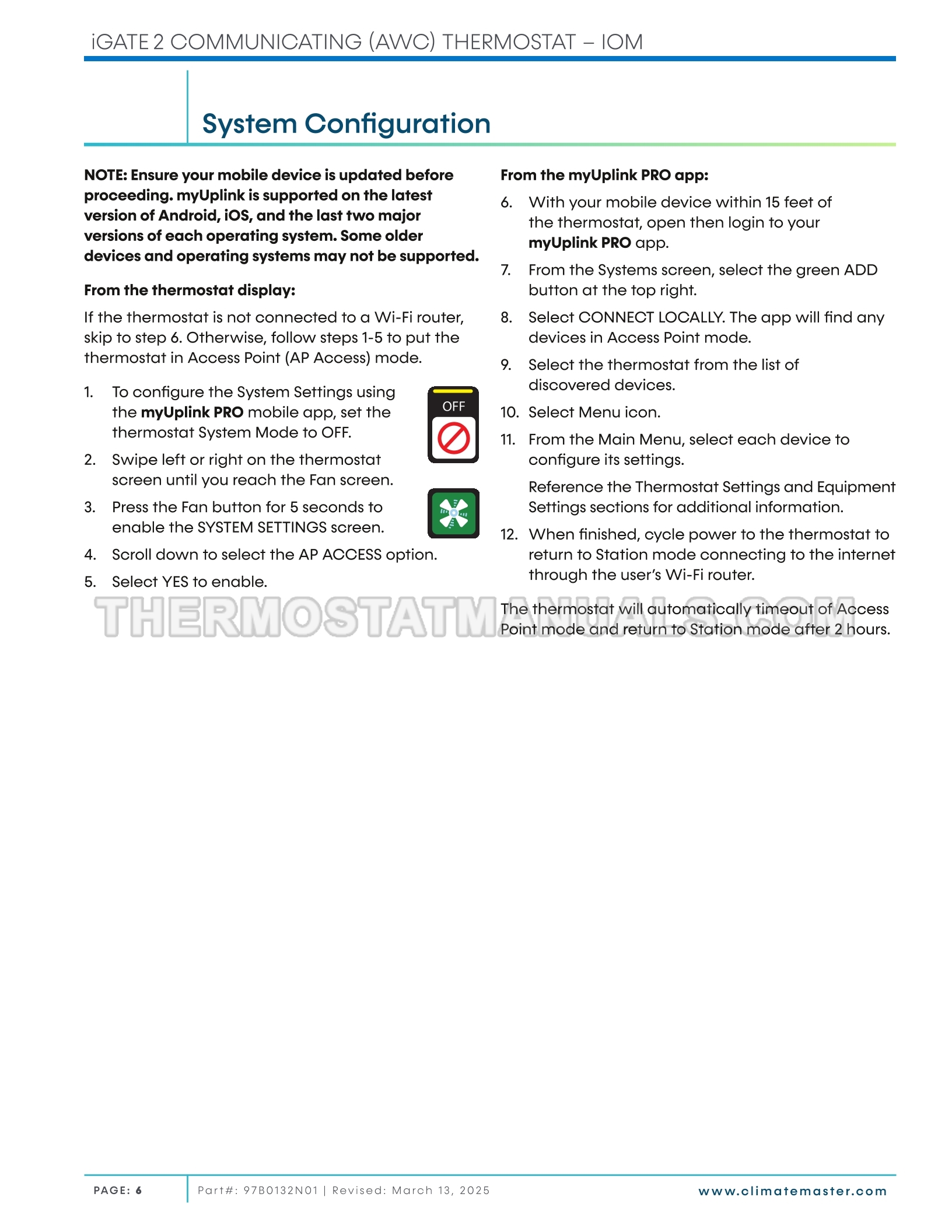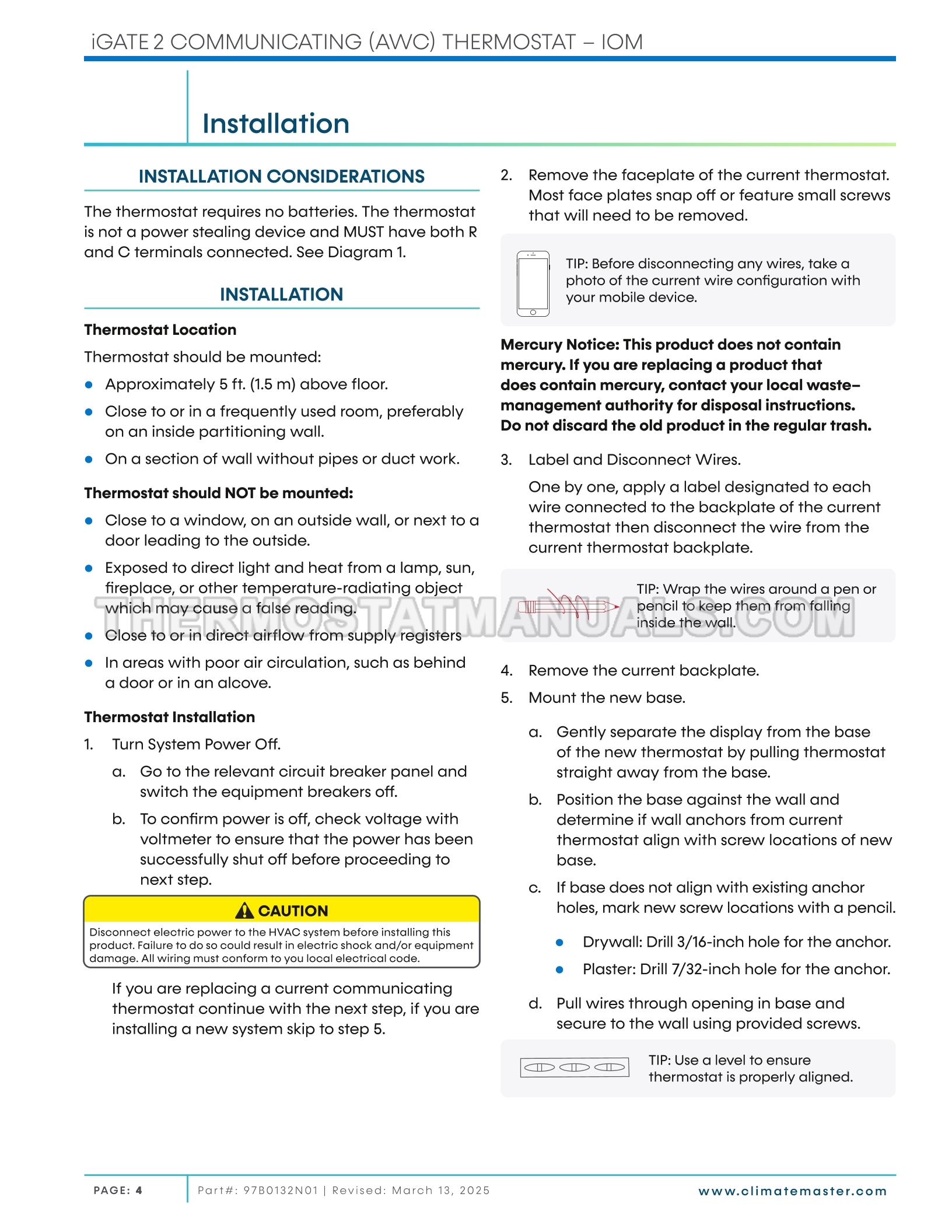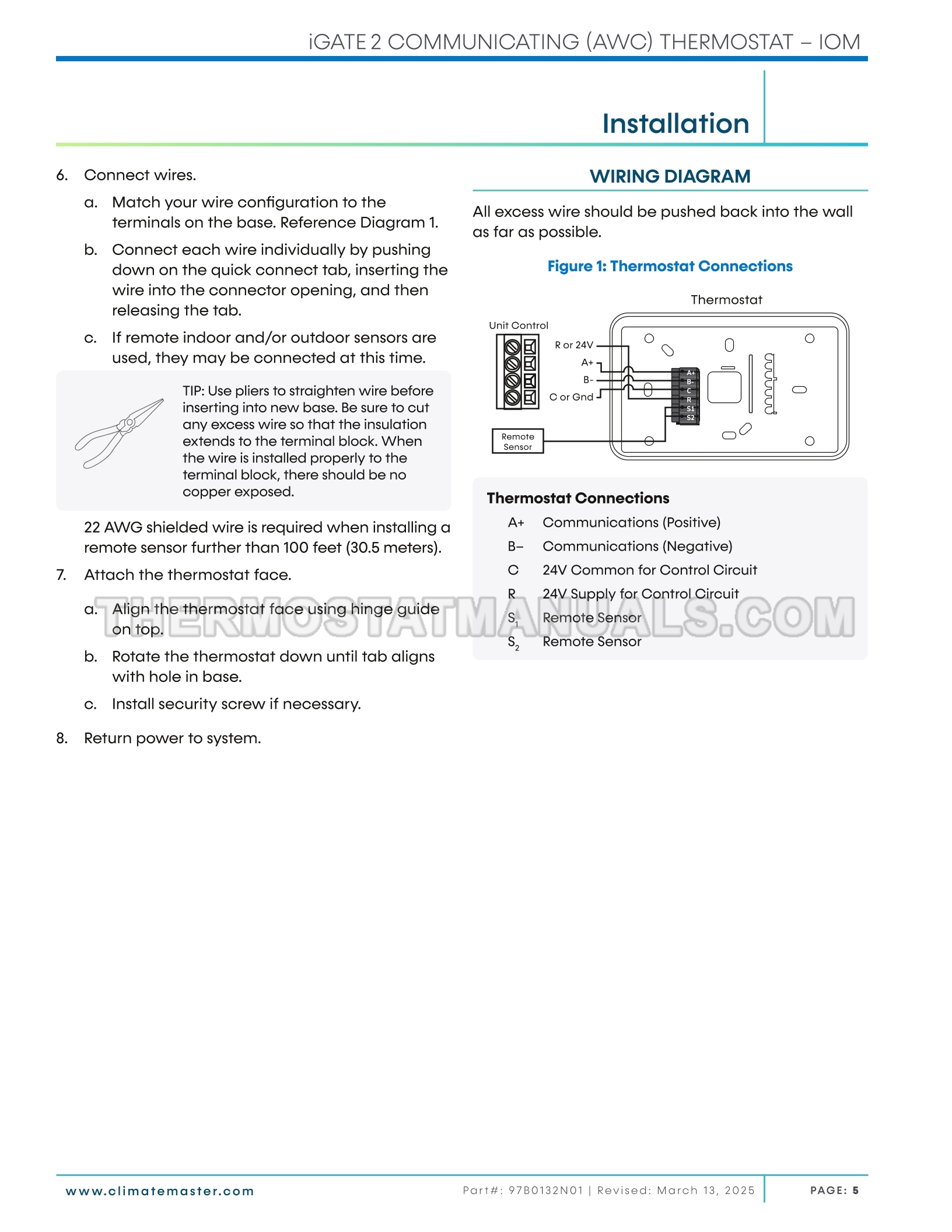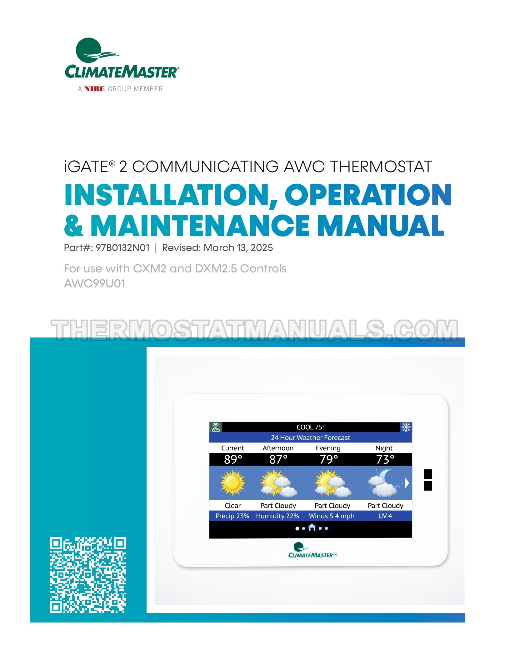 To replace the old thermostat and install the Climatemaster AWC99U01, follow the steps described in the installation, operation & maintenance manual on the 20 pages. This will allow the thermostat offering remote access, color display and flexible 7 day scheduling for enhanced comfort to be installed correctly and proceed to device configuration.