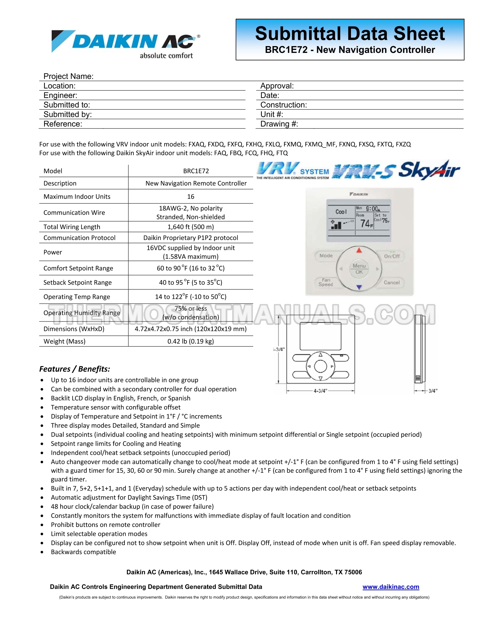 Controlling the climate in your home is not an easy task and the Daikin BRC1E72 Navigation thermostat will do just that. To ensure proper operation of the wired navigation VRV, VRV-S and SkyAir remote controller with a backlit, customizable display and the ability to control multiple indoor units thermostat, study data sheet, presented in a convenient graphical format that contains 2 pages with useful information.