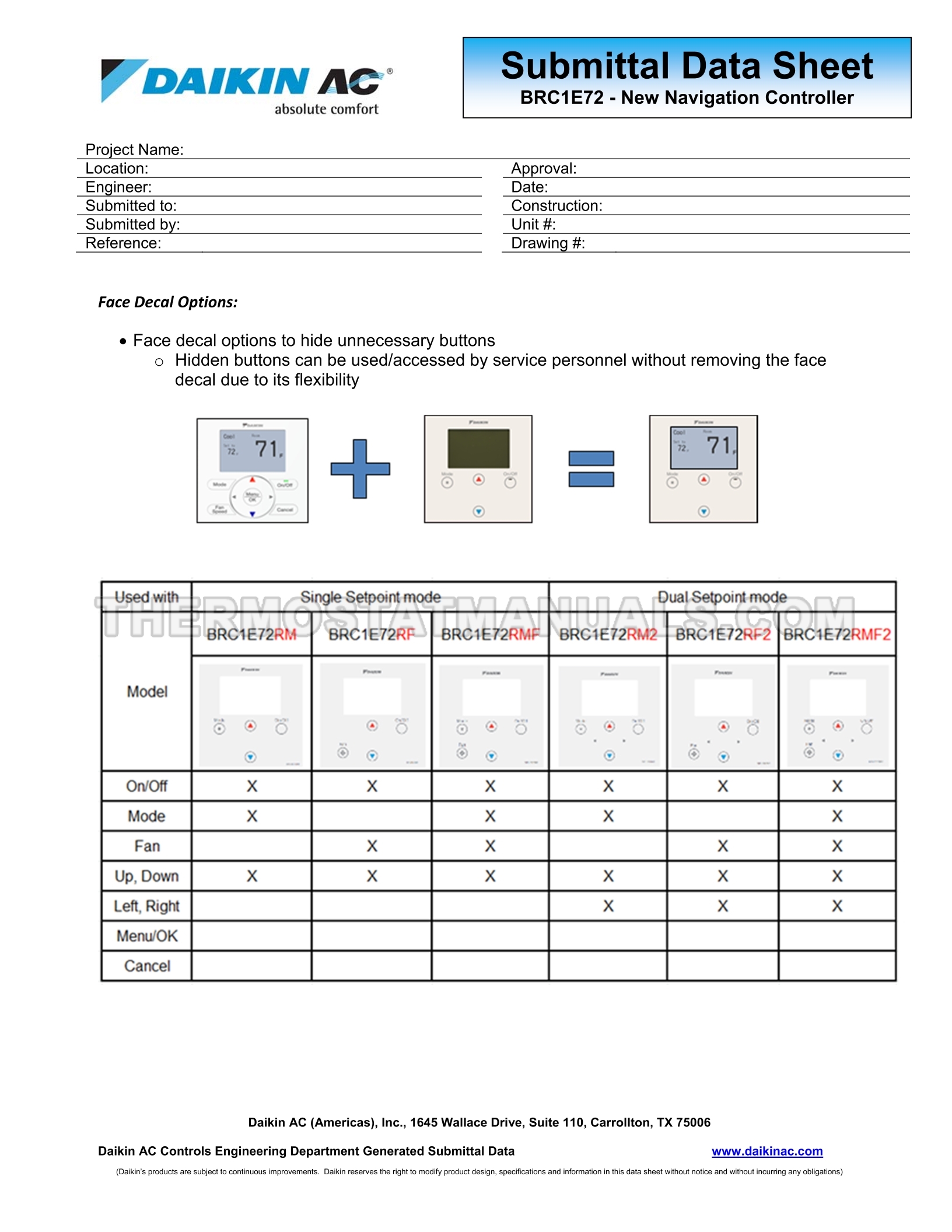 Daikin BRC1E72 Data Sheet