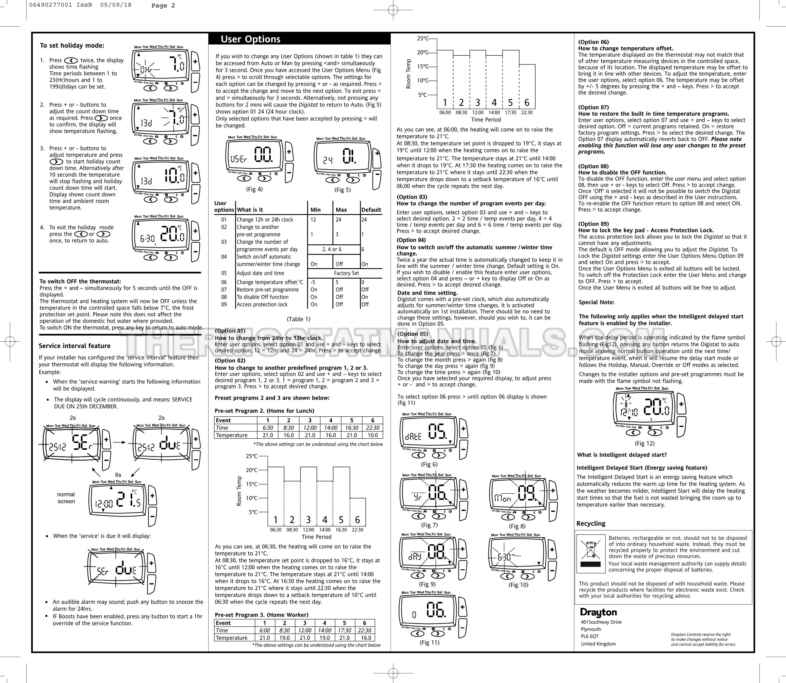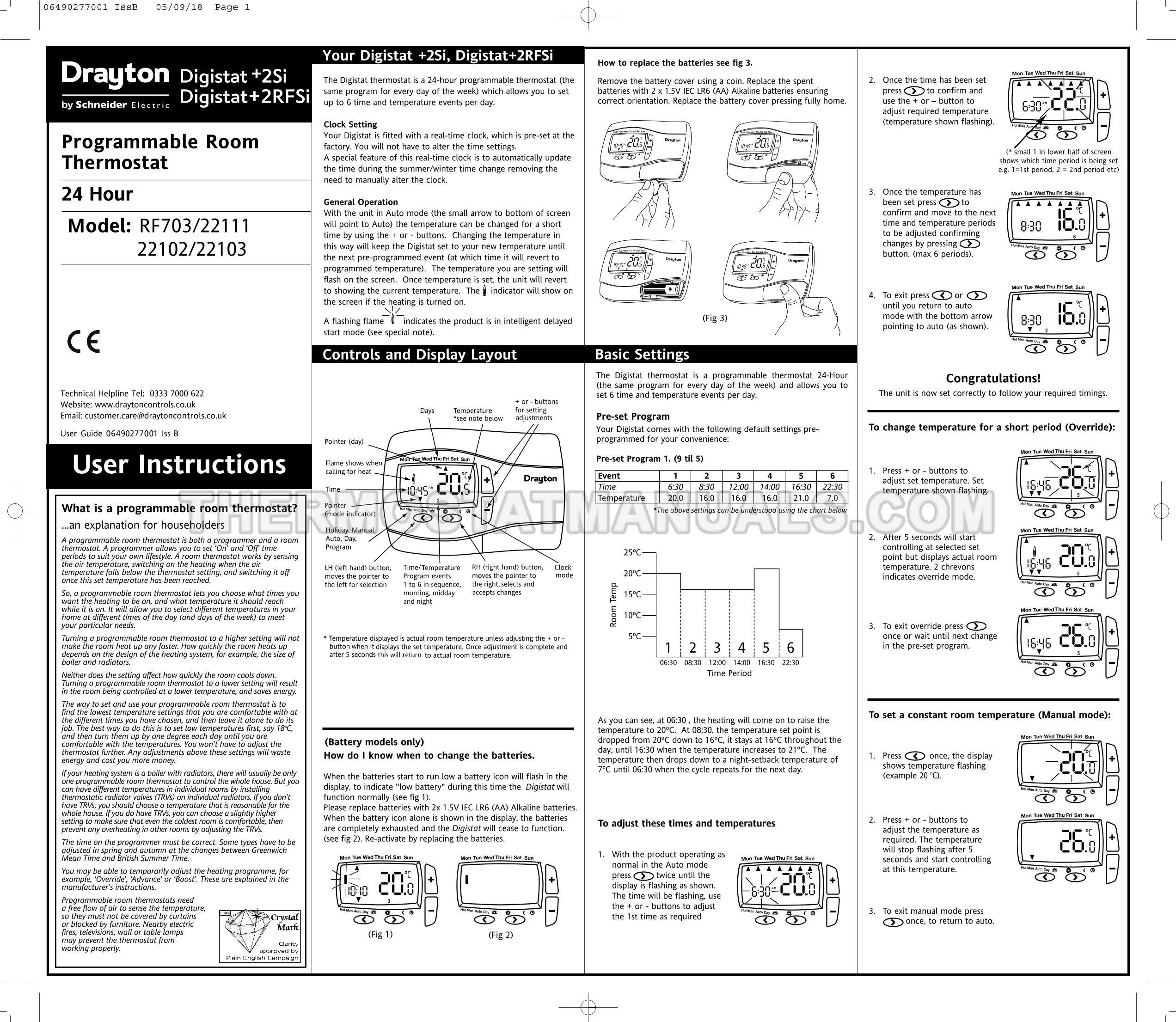 It is necessary to configure the wireless programmable 24 hour thermostat with holiday mode, ON/OFF load compensation and simple temperature override before starting its work. This will further ensure continuous and correct operation of the Drayton Digistat+2RF Si. Study the user instructions, which consists of 2 pages in English.