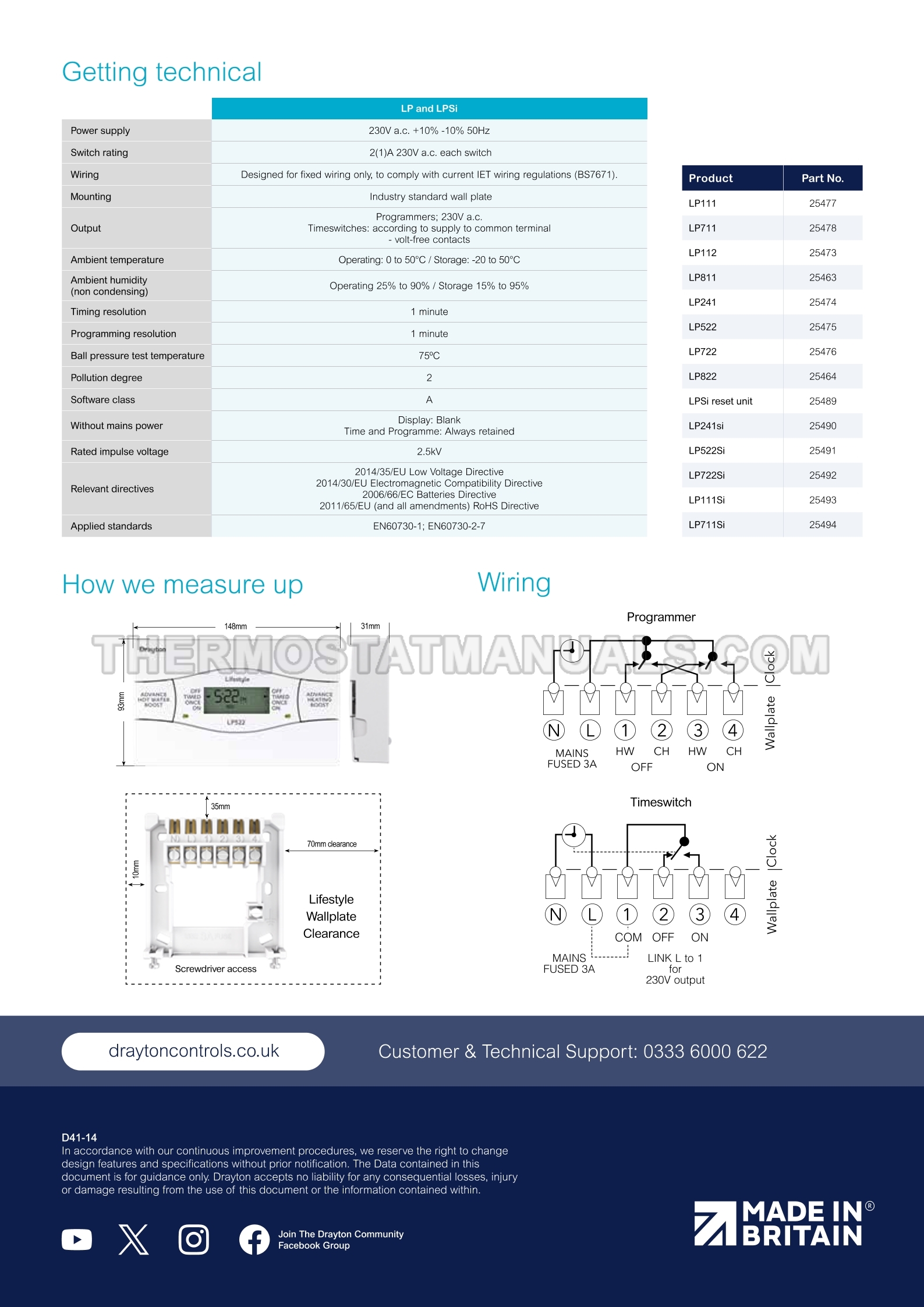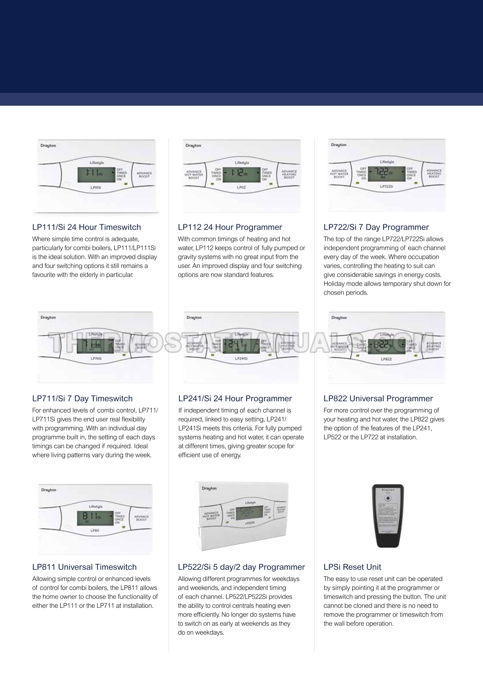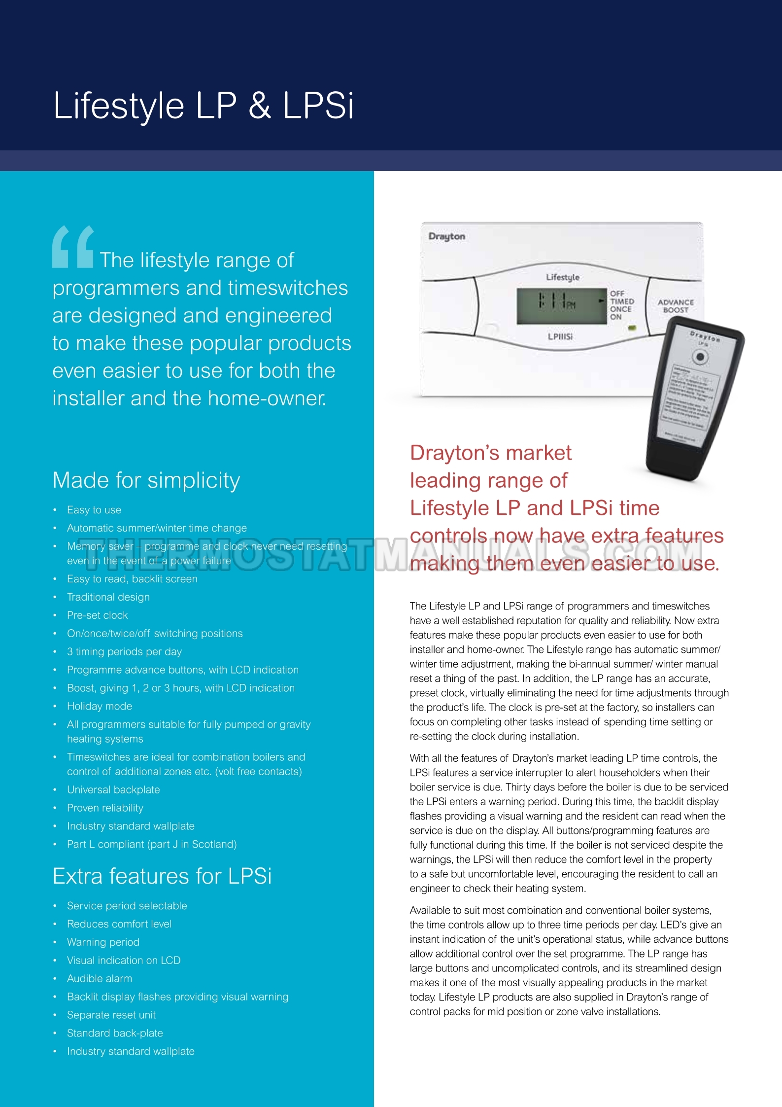 Automatic regulation of the room temperature and energy savings are the main tasks of the Drayton LP111 Lifestyle. This brochure contains all the information you need to configure the 24 hour timeswitch (25477) thermostat at the first start-up and further work.