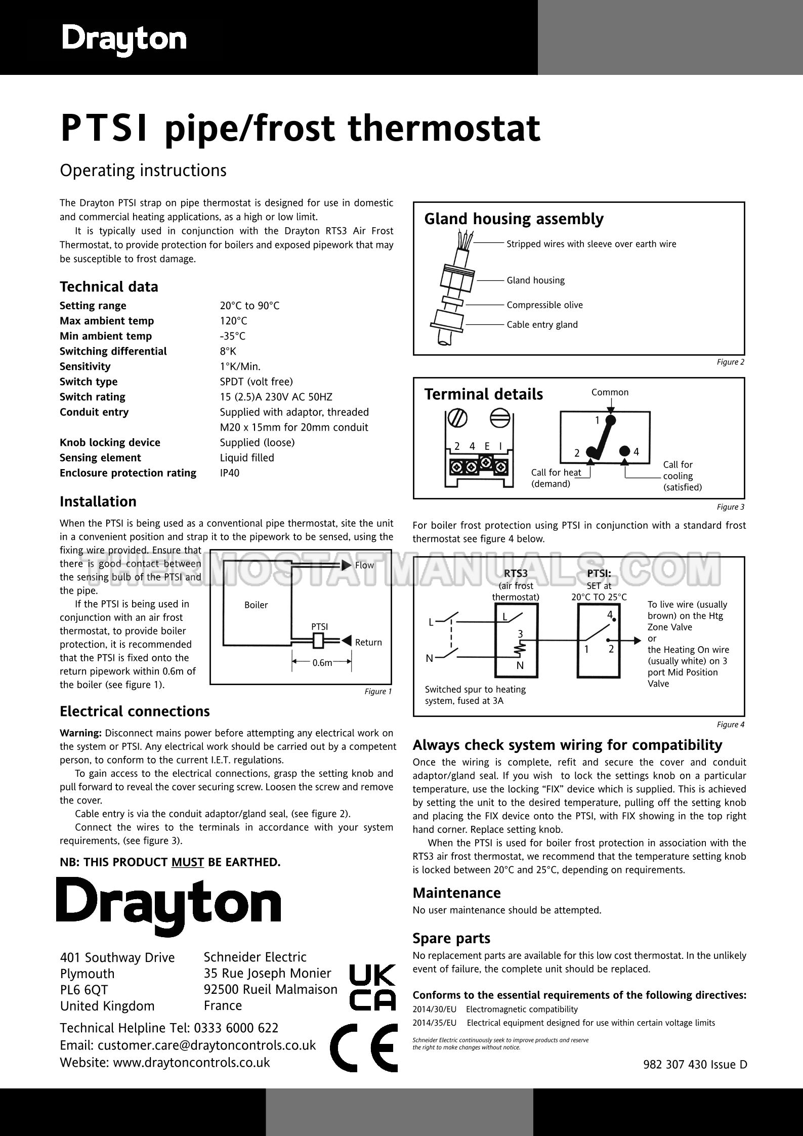 It is necessary to configure the pipe/frost thermostat with changeover contacts and lockable setting knob for versatile high or low limit use before starting its work. This will further ensure continuous and correct operation of the Drayton PTS1. Study the operating instructions, which consists of 1 pages in English.