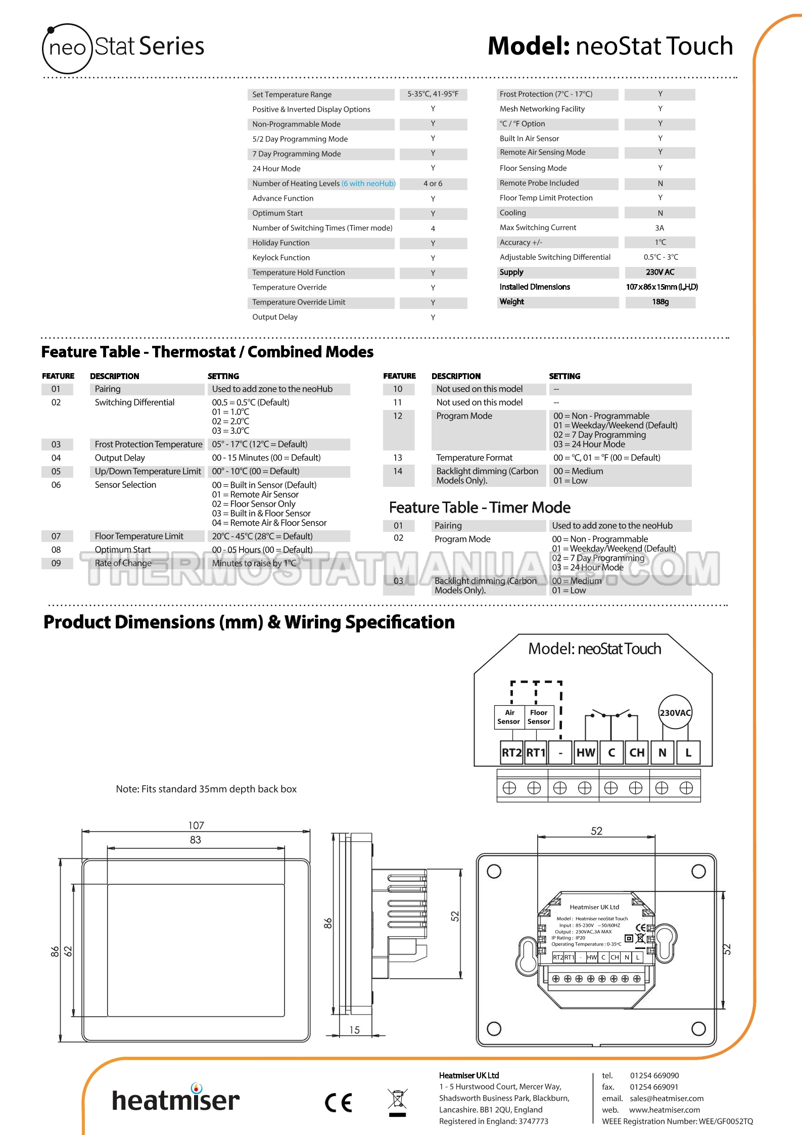It is necessary to configure the glass touchscreen thermostat with proximity-activated display for combined heating and hot water control via the neoHub ecosystem before starting its work. This will further ensure continuous and correct operation of the Heatmiser neoStat Touch Neo. Study the datasheet, which consists of 1 pages in English.