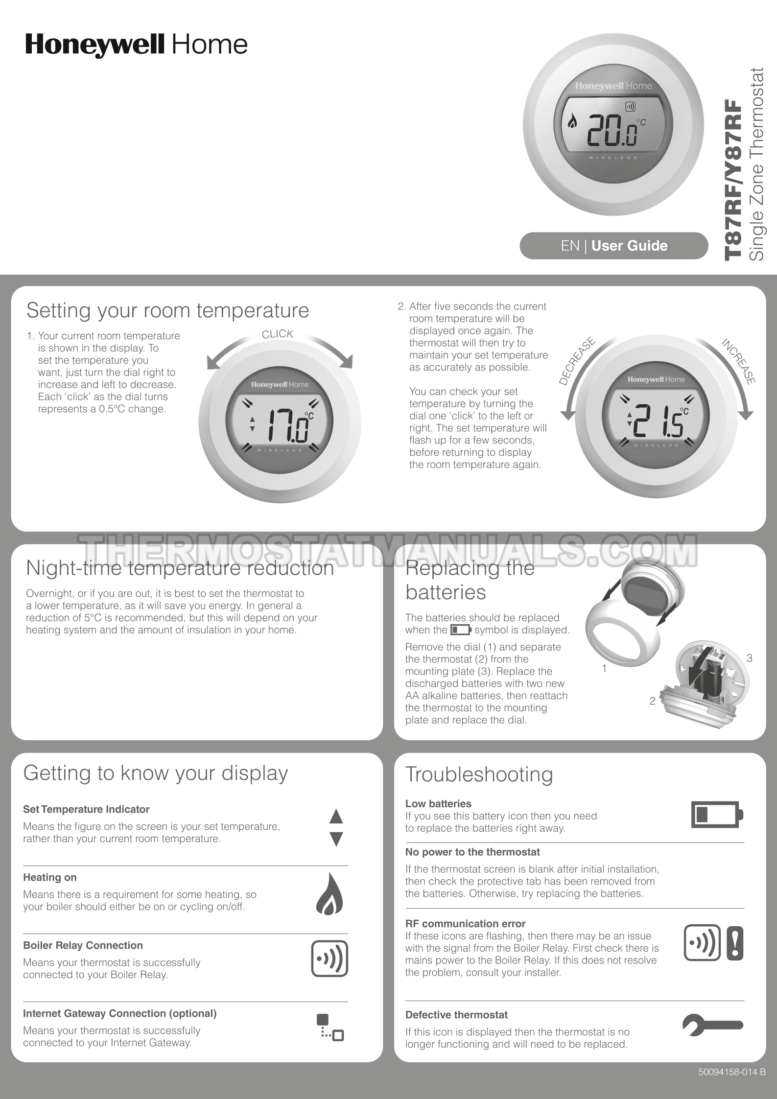 It is necessary to configure the single zone thermostat before starting its work. This will further ensure continuous and correct operation of the Honeywell Y87RF. Study the user guide, which consists of 2 pages in English.